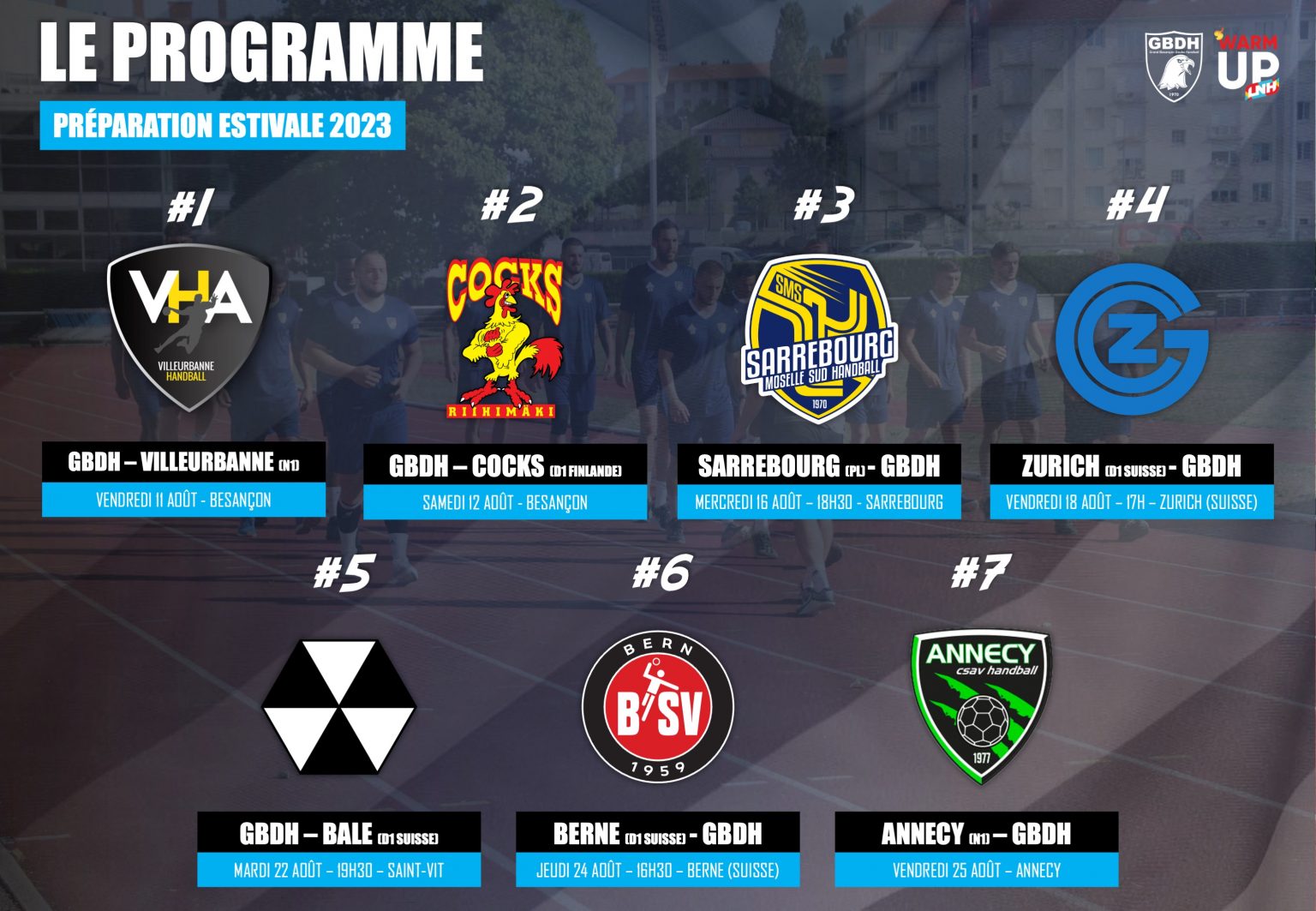 Avant cette première sortie en compétition, le groupe professionnel va disputer 7 rencontres amicales en débutant face à Villeurbanne (Proligue) le vendredi 11 août à Besançon. Dès le lendemain, le GBDH enchaînera face au COCKS de Finlande toujours à Besançon ! L’ancien club dirigé par Christophe Viennet, nouveau coach du club, sera de nouveau en France pour leur préparation !