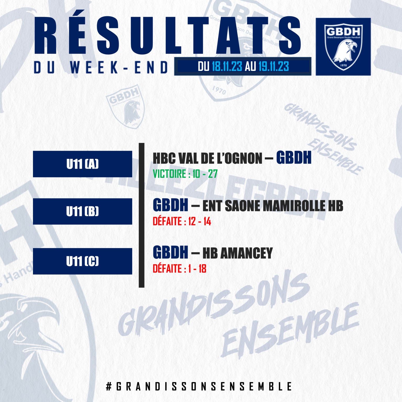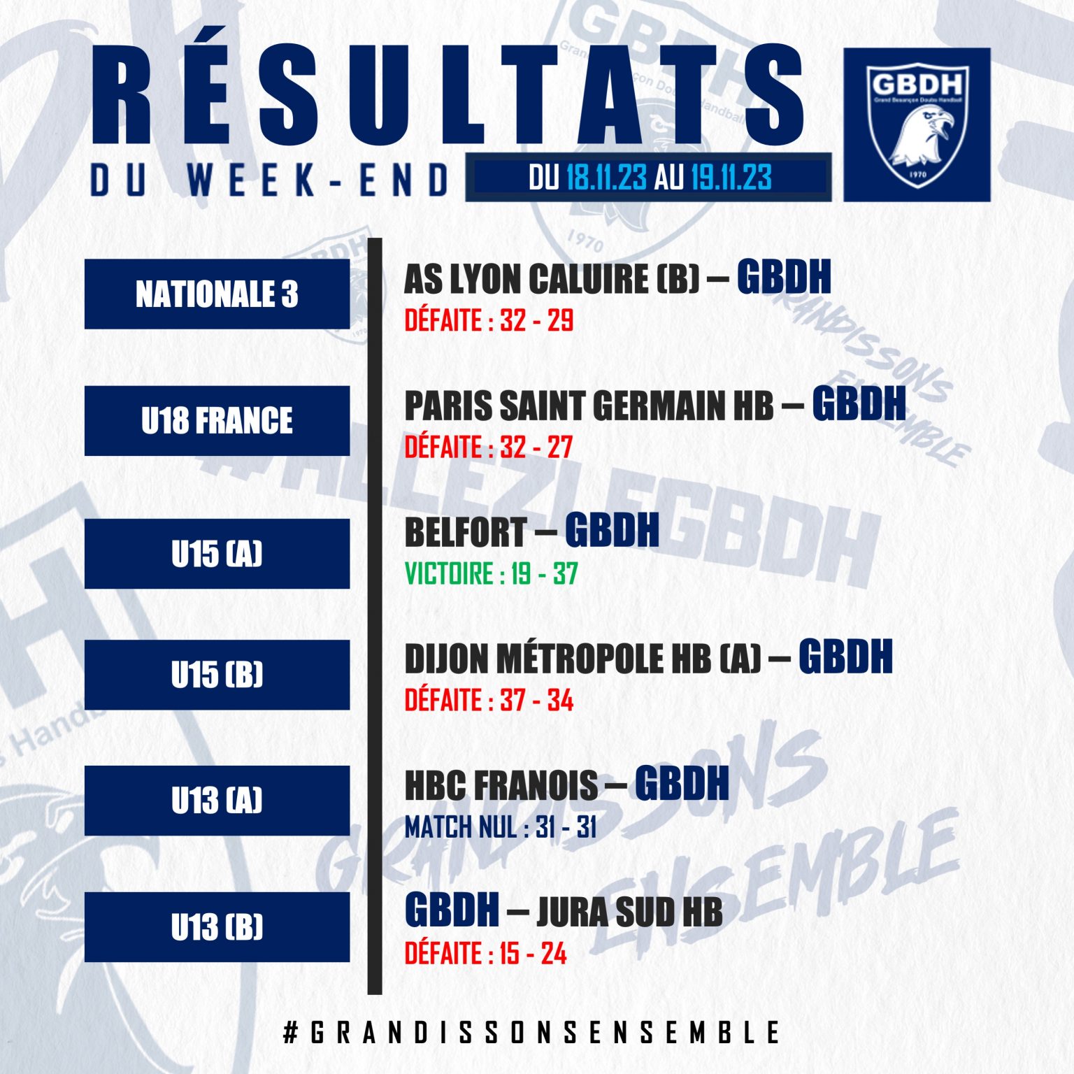 #JEUNES : LES RÉSULTATS DU WEEK-END / 18-19 NOVEMBRE 2023 GBDH il y a 2 ans LES RÉSULTATS DU WEEK-END !Retrouvez ci-dessous les résultats de notre secteur amateur pour le week-end du 18-19 novembre 2023 ! ALLEZ LE GBDH !