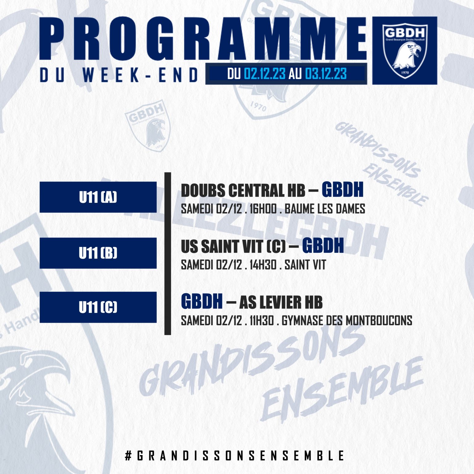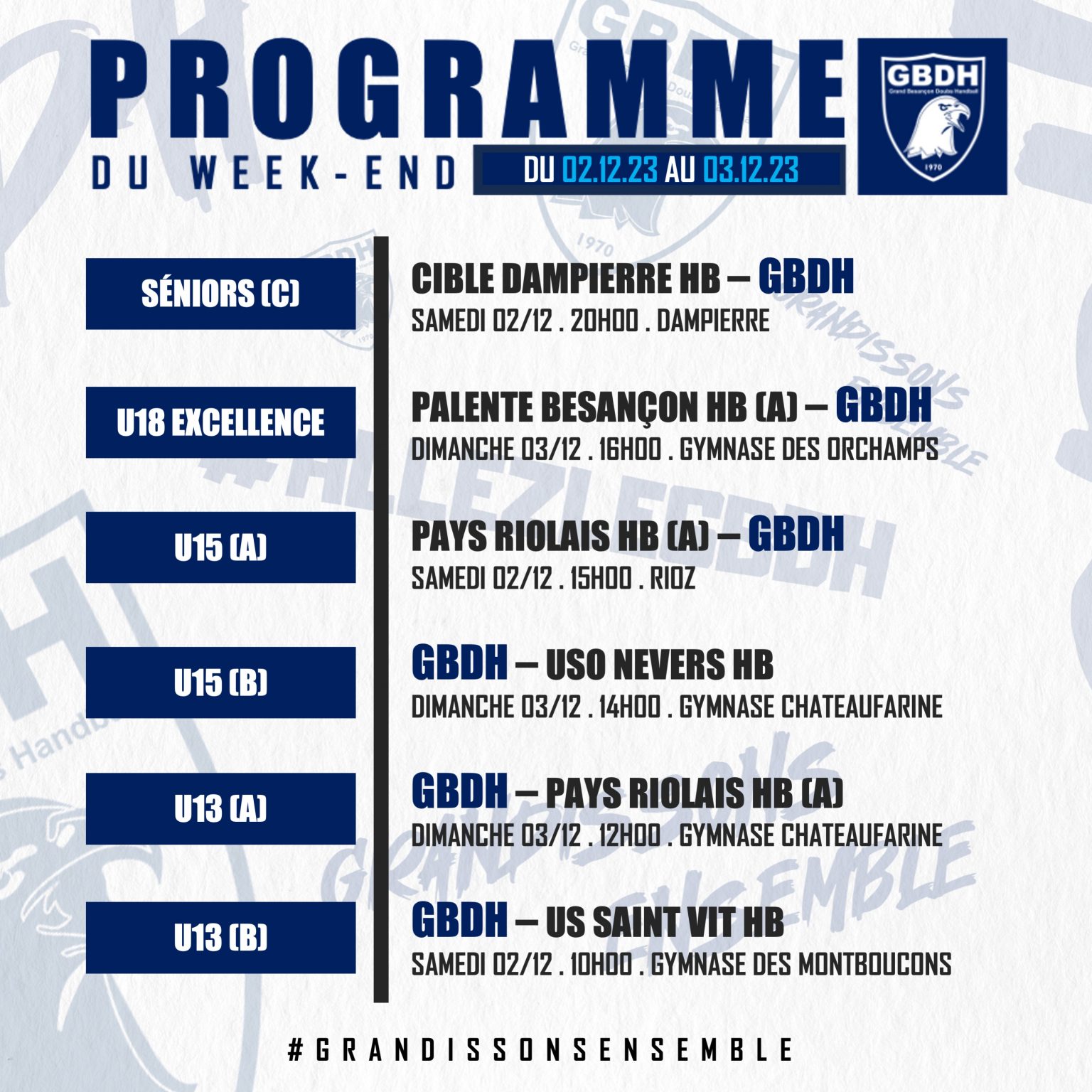 #JEUNES : PROGRAMME DU WEEK-END / 02-03 DÉCEMBRE 2023 GBDH il y a 2 ans LE PROGRAMME DU WEEK-END !Retrouvez ci-dessous les différentes rencontres de notre secteur amateur pour ce week-end ! ALLEZ LE GBDH !