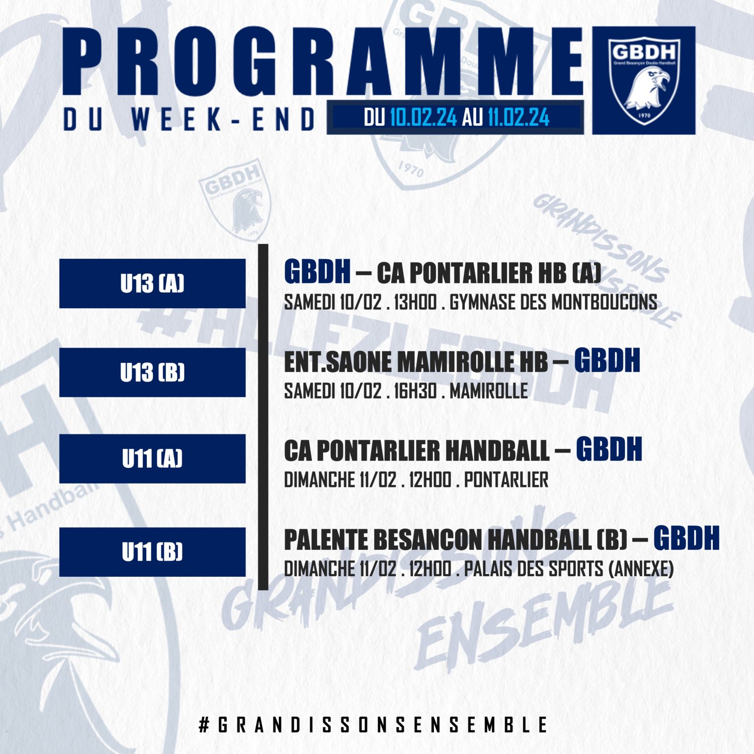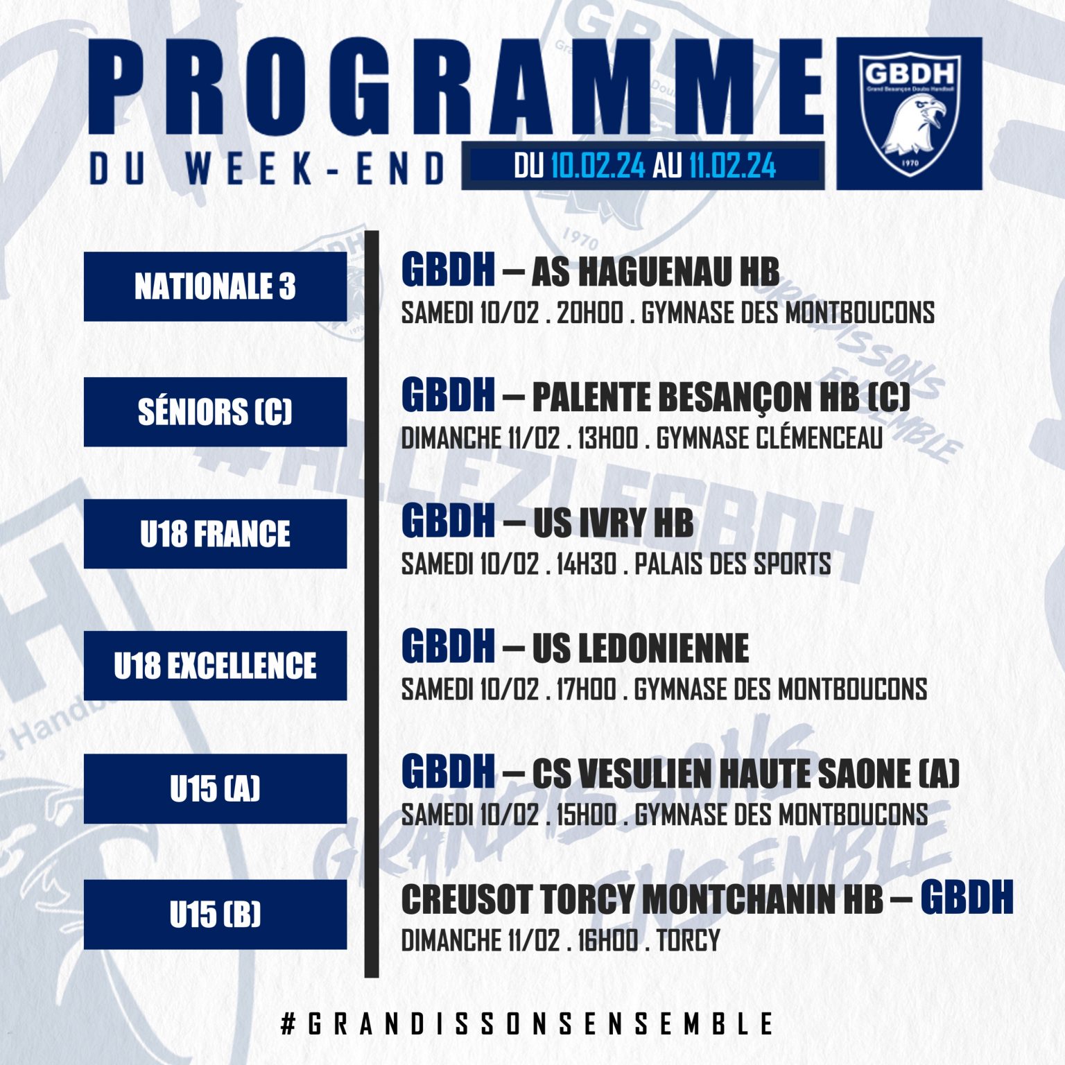 #JEUNES : PROGRAMME DU WEEK-END / 10-11 FÉVRIER 2024 GBDH il y a 2 ans LE PROGRAMME DU WEEK-END !Retrouvez ci-dessous les différentes rencontres de notre secteur amateur pour ce week-end ! Les rendez-vous à ne pas louper :GBDH – US IVRY HANDBALL (U18 France) samedi au Palais des Sports Ghani-Yalouz à 14h30 – Entrée Gratuite !GBDH – AS Haguenau Handball (N3) samedi au Gymnase des Montboucons à 20h – Entrée Gratuite ! ALLEZ LE GBDH !