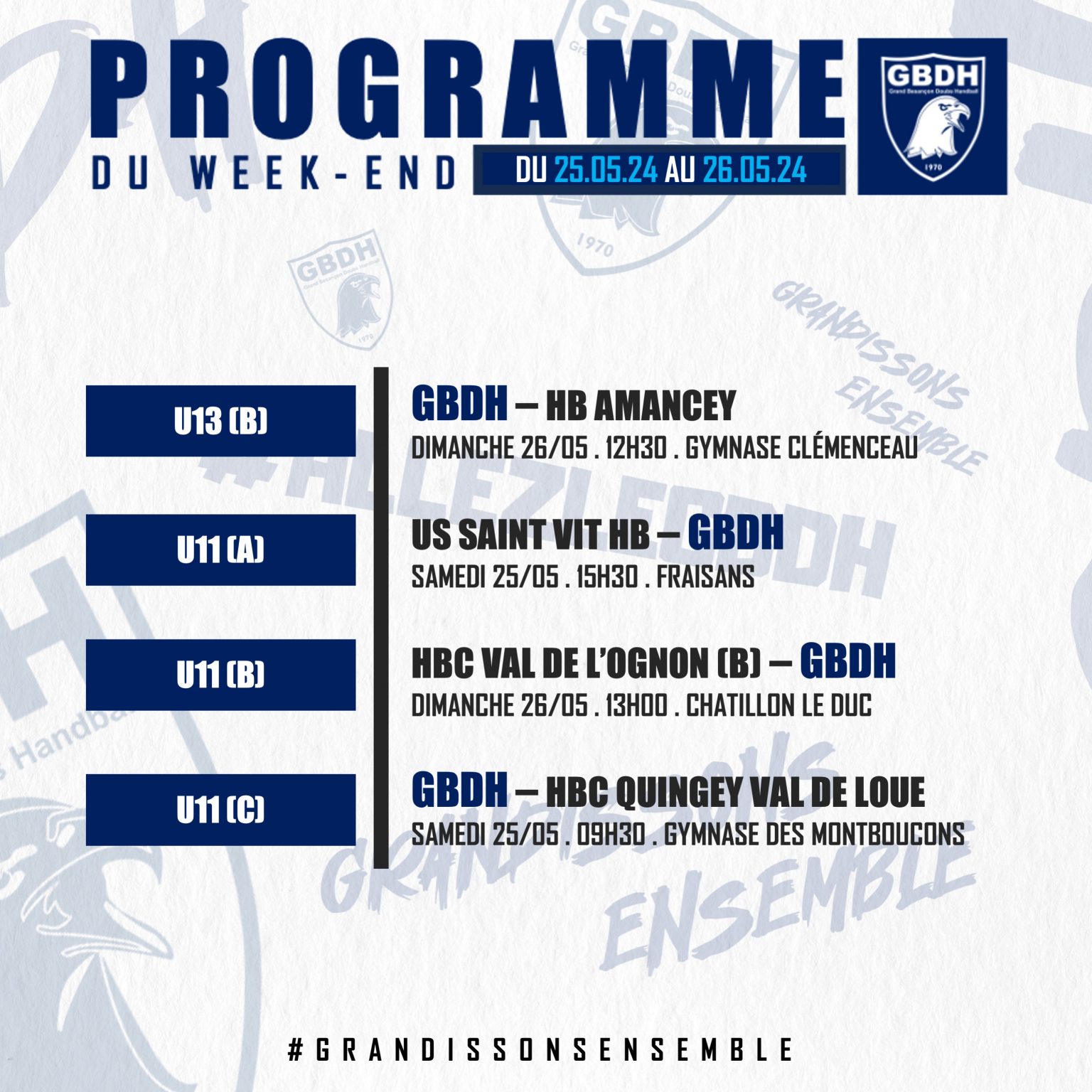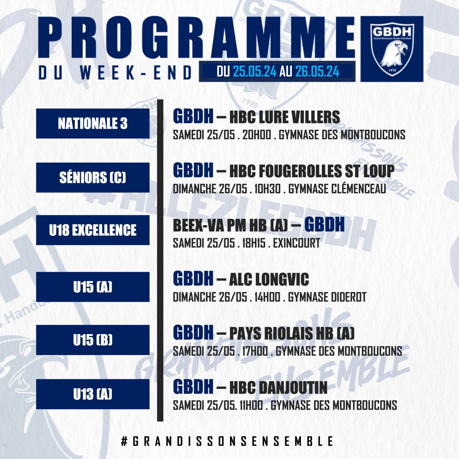 #JEUNES : PROGRAMME DU WEEK-END / 25-26 MAI 2024 GBDH il y a 1 an LE PROGRAMME DU WEEK-END !Retrouvez ci-dessous les différentes rencontres de notre secteur amateur pour ce week-end ! ALLEZ LE GBDH !