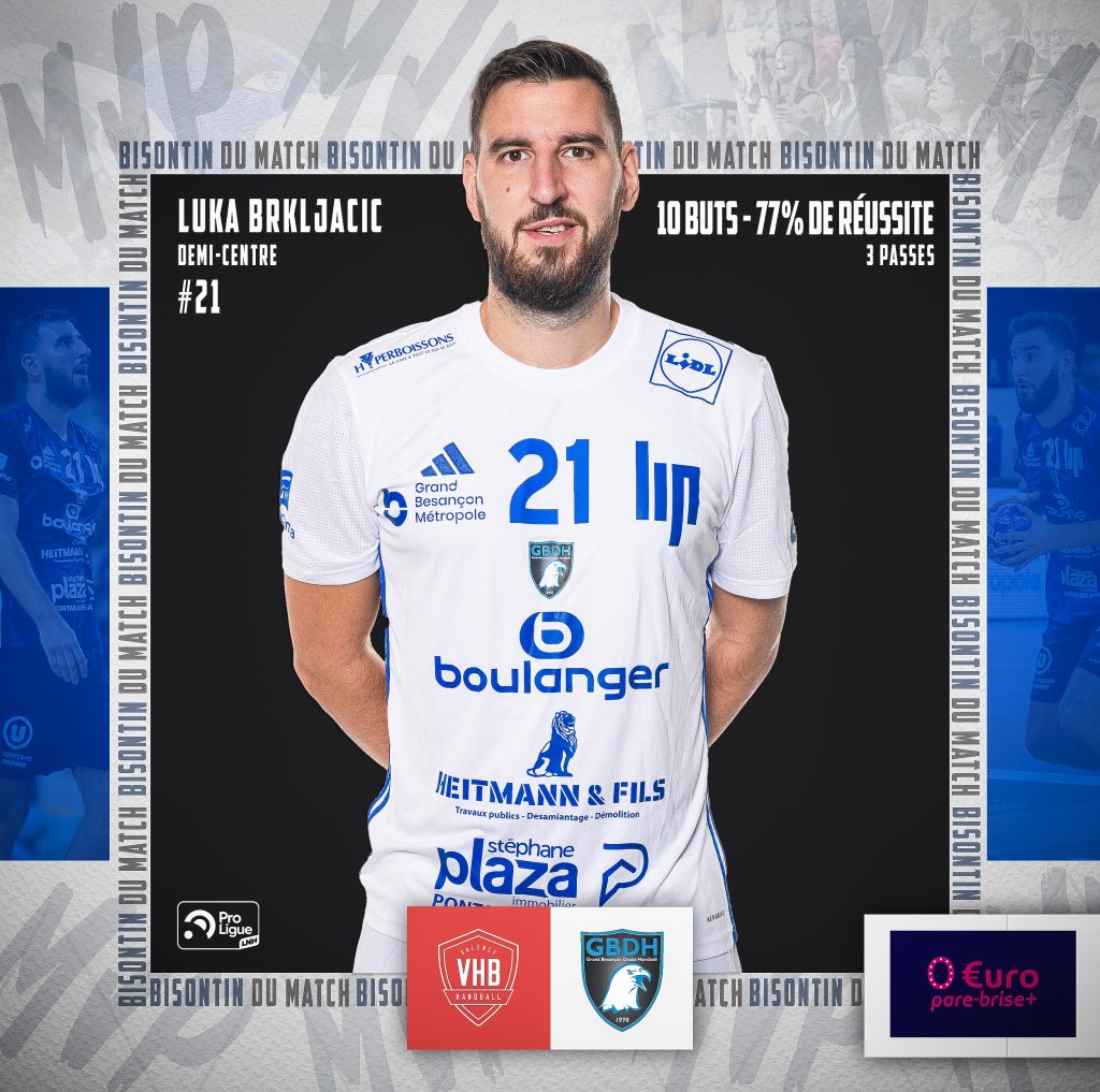 Le demi-centre, Luka Brkljacic, auteur de 10 buts avec une remarquable efficacité de 70 % au tir, s’est particulièrement illustré et a été le Bisontin du match. En plus de ses performances offensives, il a également délivré 3 passes décisives.