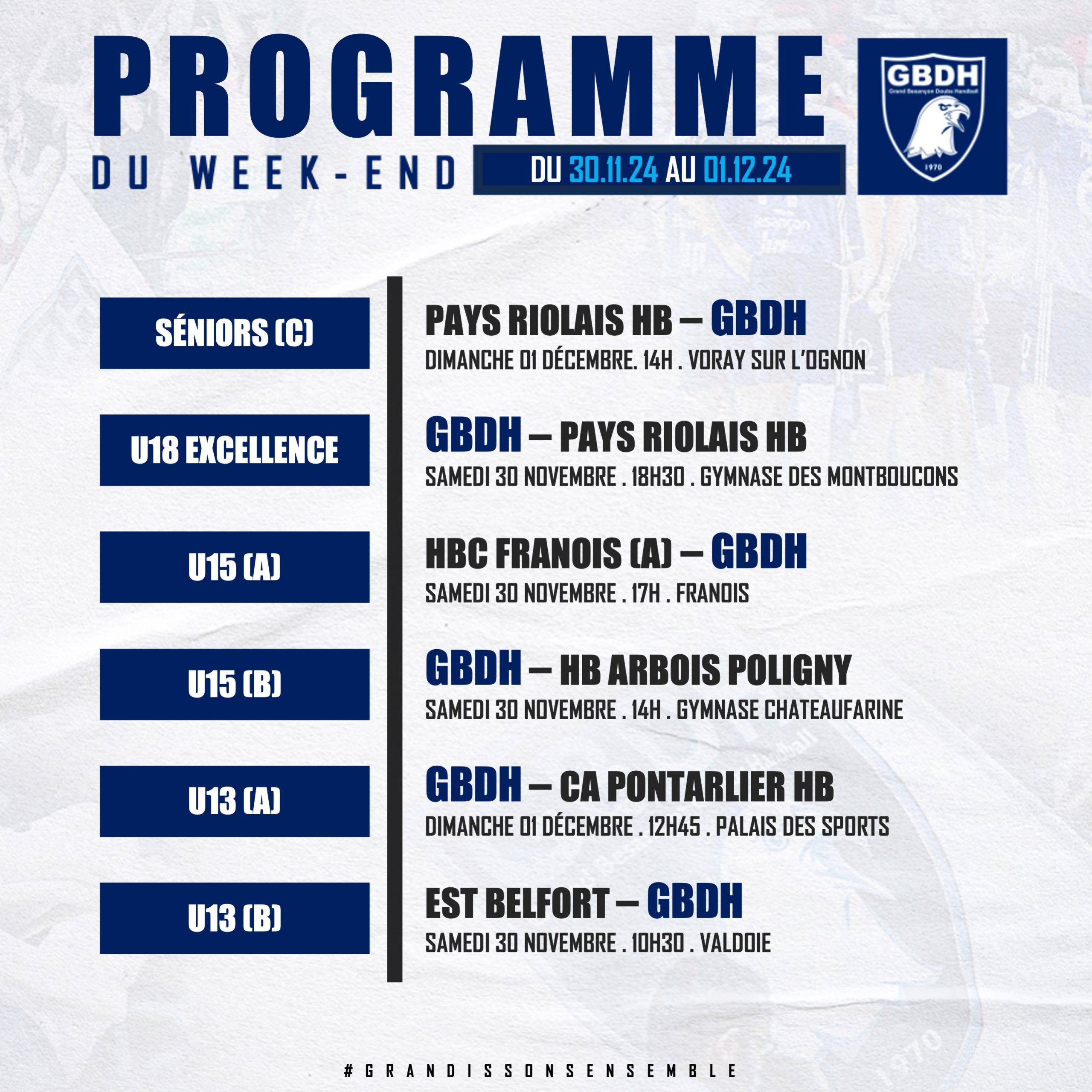 #FORMATION : LE PROGRAMME DU WEEK-END – 30 NOVEMBRE/01 DÉCEMBRE 2024 GBDH il y a 11 mois LE PROGRAMME DU WEEK-END !Retrouvez ci-dessous les différentes rencontres de notre secteur amateur pour ce week-end ! ALLEZ LE GBDH !