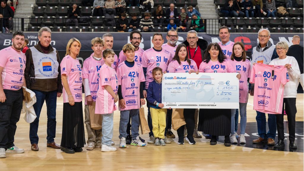 Vendredi dernier, lors de la mi-temps du match face à Cournon d’Auvergne, un moment de solidarité a marqué la soirée. Le président du club, accompagné des généreux participants ayant acquis les maillots en édition spéciale Octobre Rose, a remis un don de 1 500 € à la Ligue contre le Cancer – Comité du Doubs Besançon.