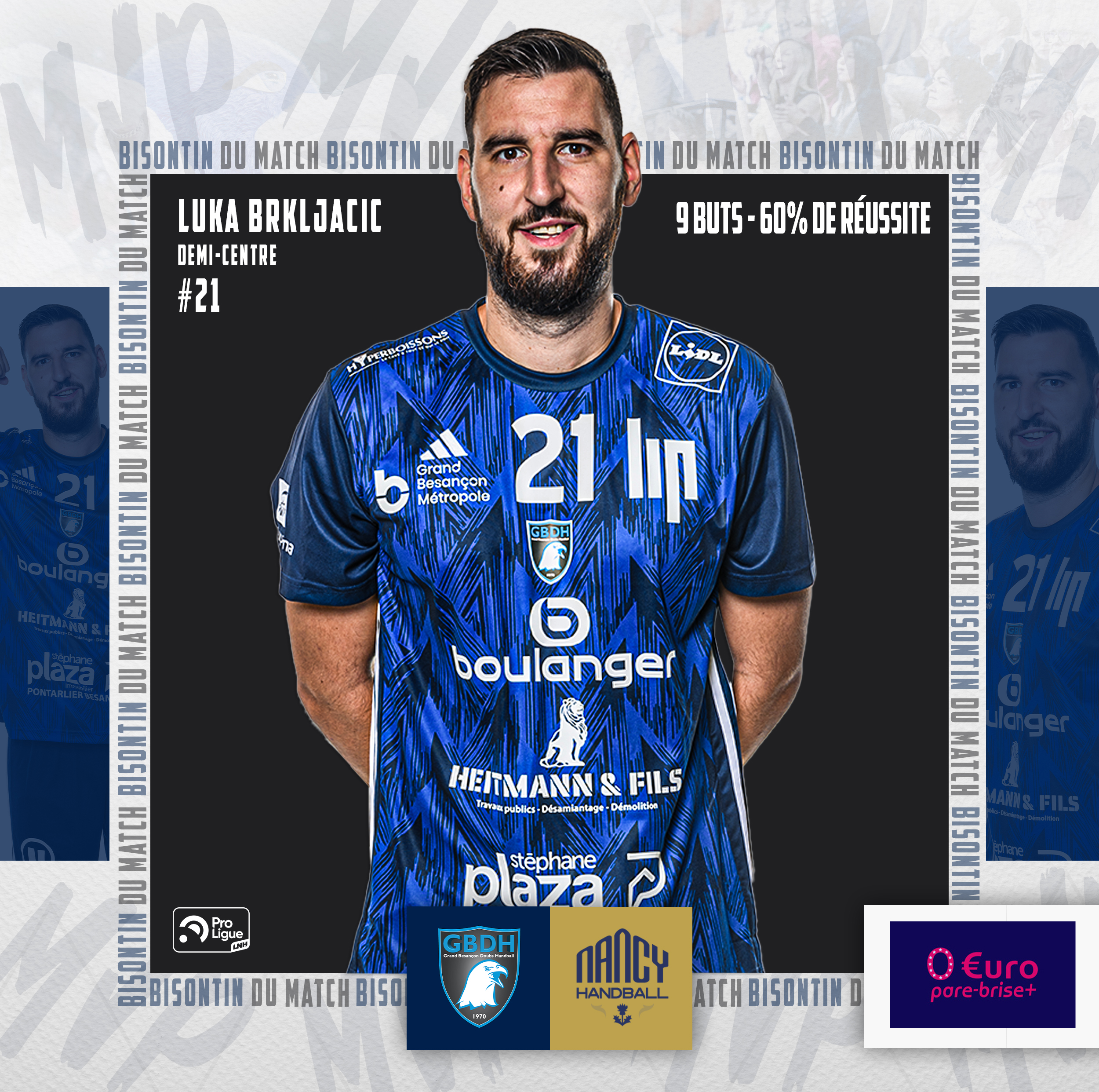 Luka BRKLJACIC s’est distingué comme l’homme du match. Notre demi-centre a brillé avec 9 buts inscrits, 60 % de réussite au tir, et 7 passes décisives. Véritable moteur de l’attaque bisontine, il a su exploiter chaque faille de la défense adverse et orchestrer le jeu de son équipe avec brio.