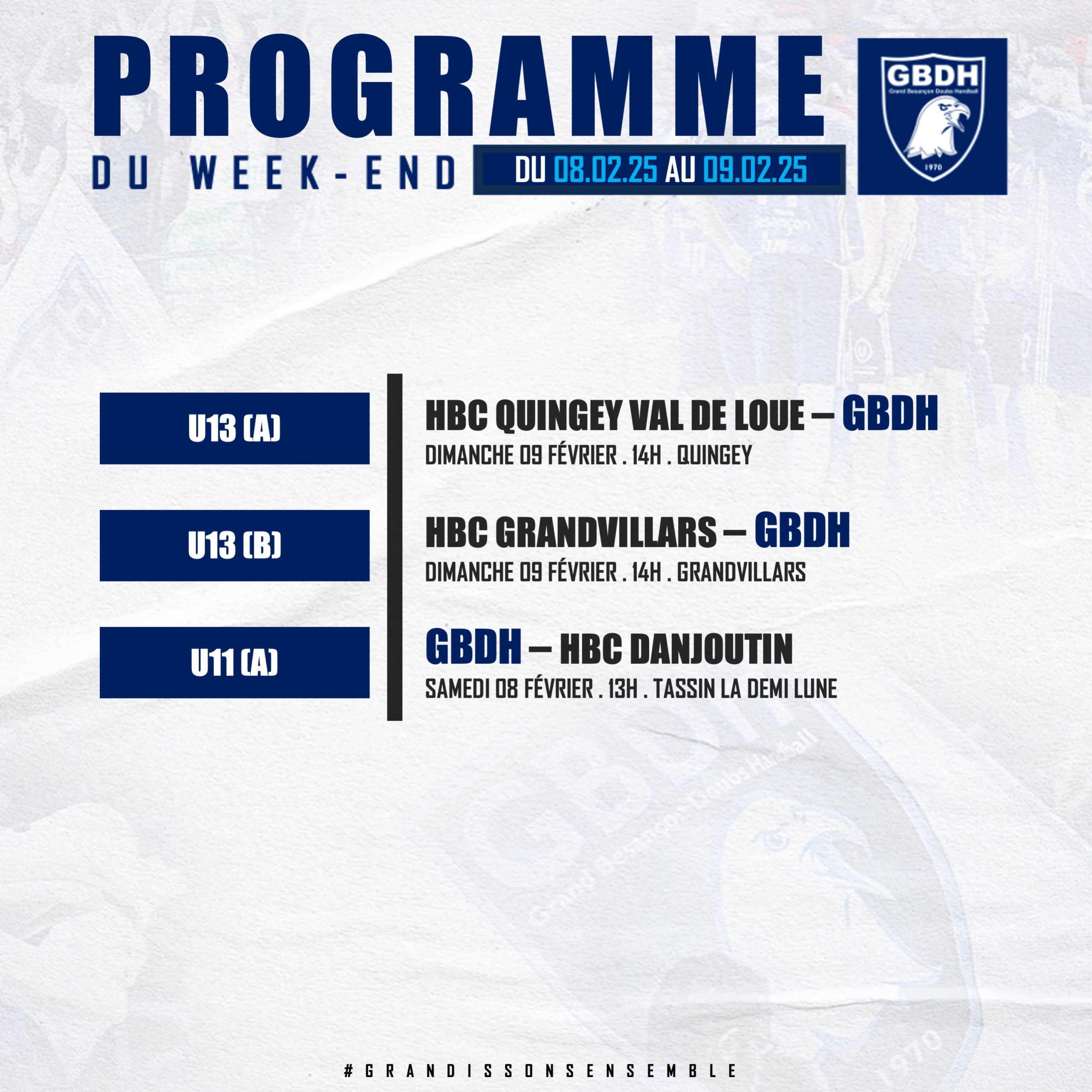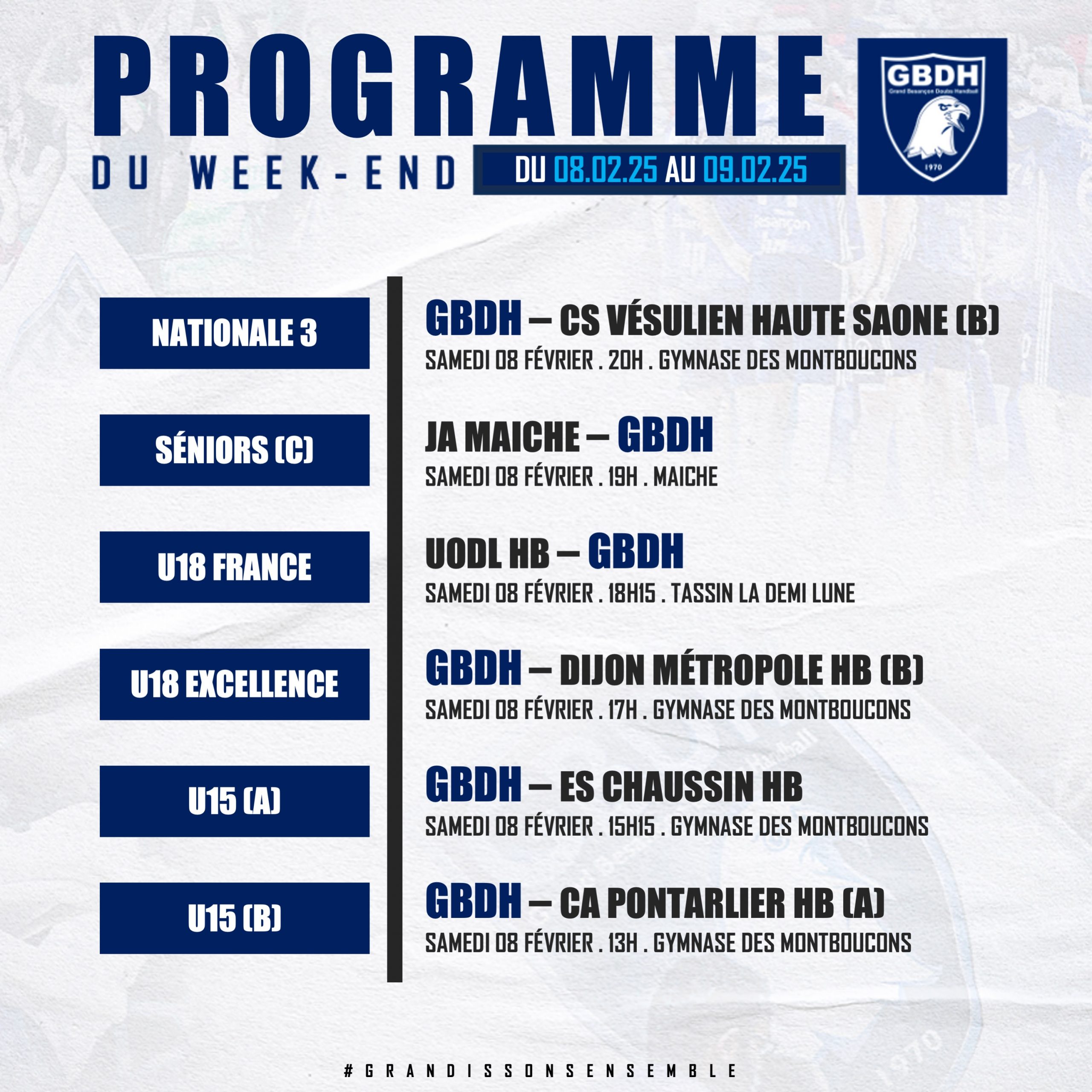 #FORMATION : LE PROGRAMME DU WEEK-END – 08/09 FÉVRIER 2025 GBDH il y a 8 mois LE PROGRAMME DU WEEK-END !Retrouvez ci-dessous les différentes rencontres de notre secteur amateur pour ce week-end ! ALLEZ LE GBDH !