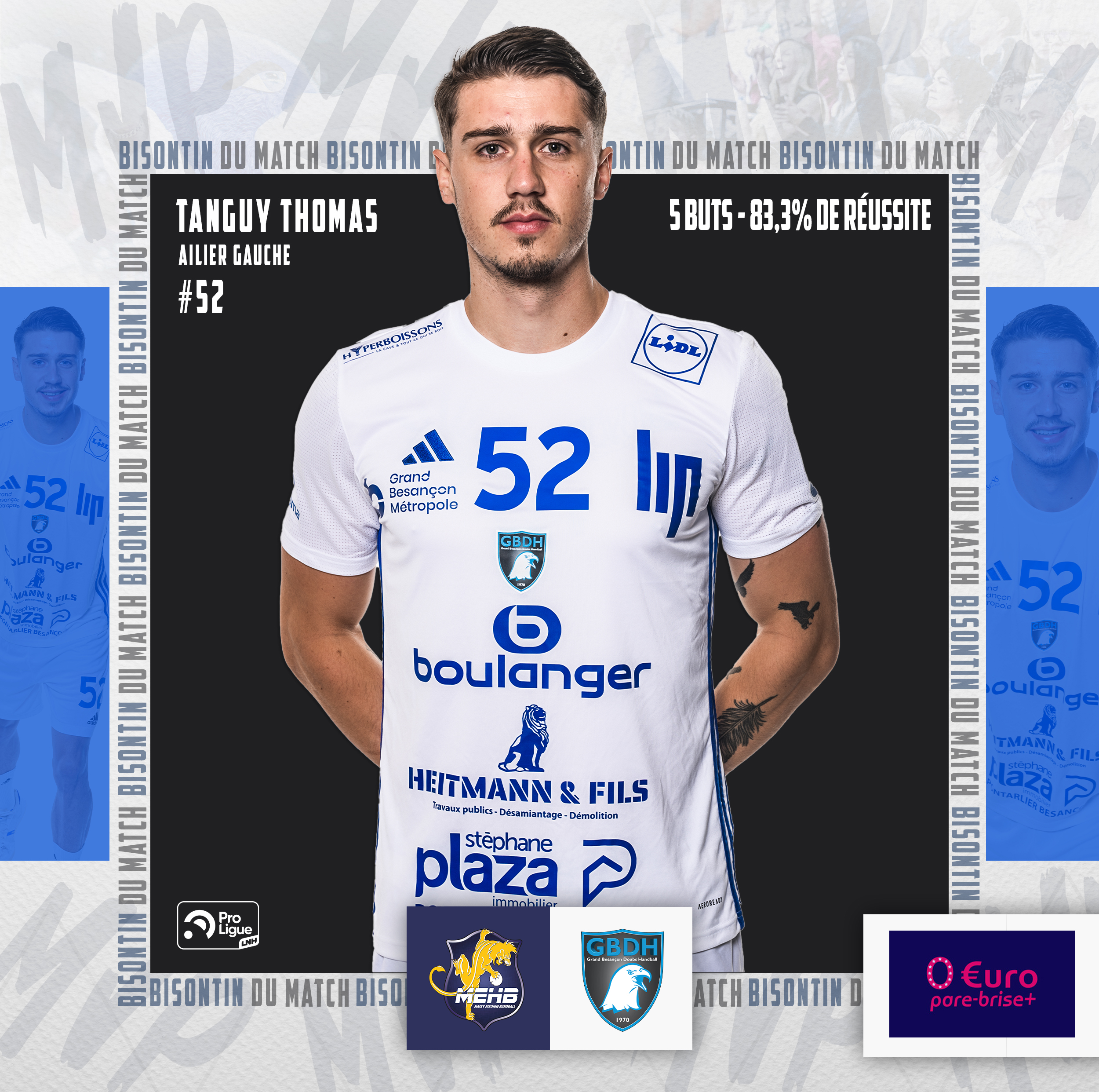 Tanguy Thomas s’est illustré comme l’un des artisans majeurs du succès bisontin face à Massy. Avec 5 buts et un taux de réussite au tir de 83,3 %, l’ailier gauche du GBDH a fait preuve d’une efficacité redoutable. Sa capacité à conclure les actions et son impact dans le jeu offensif ont été des atouts déterminants dans la maîtrise du match.