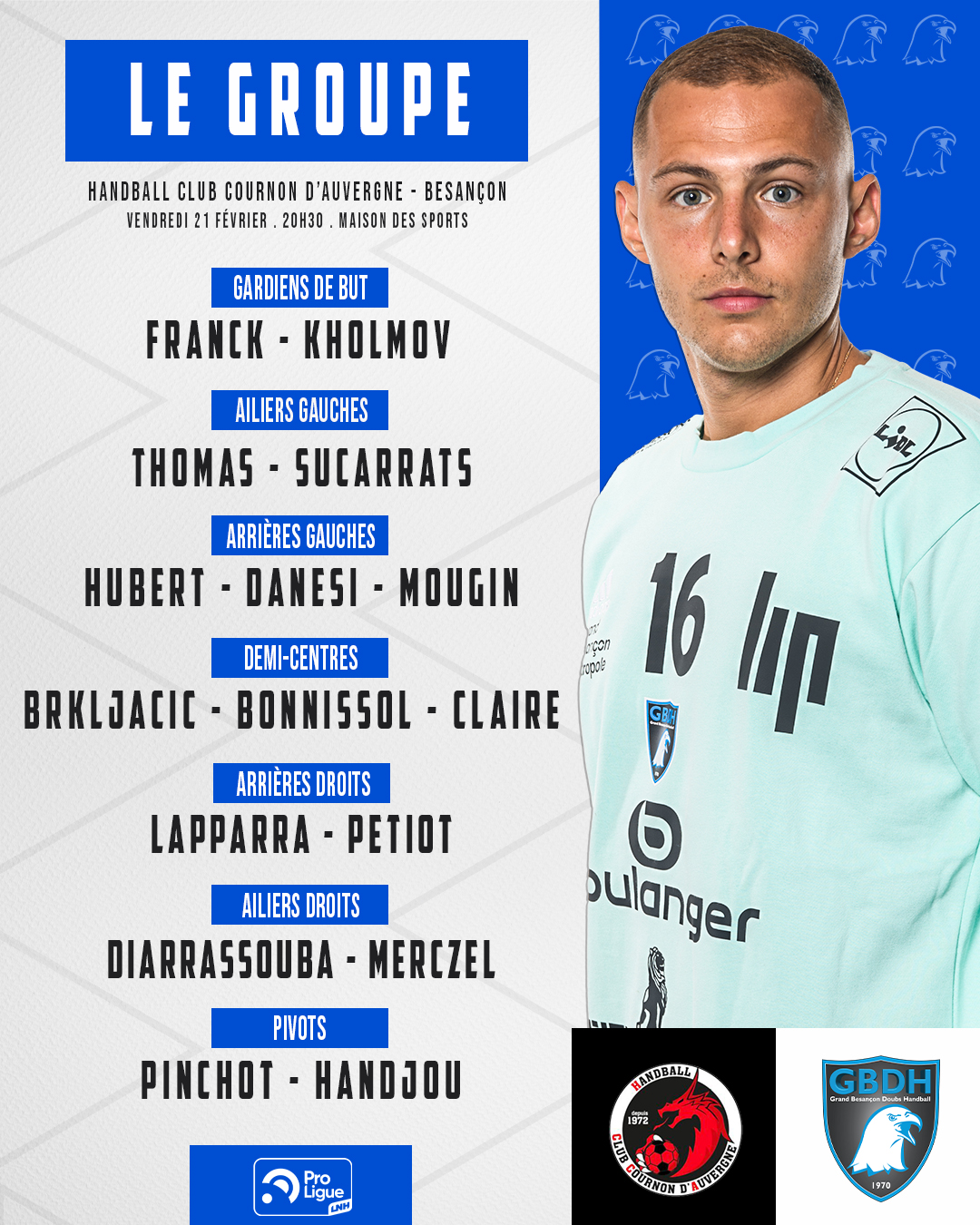 Ce soir, le Grand Besançon Doubs Handball (13ème) se déplace en Auvergne pour affronter le Handball Club Cournon d’Auvergne (11ème) avec un objectif clair : poursuivre sa belle série et ramener deux nouveaux points à la maison !