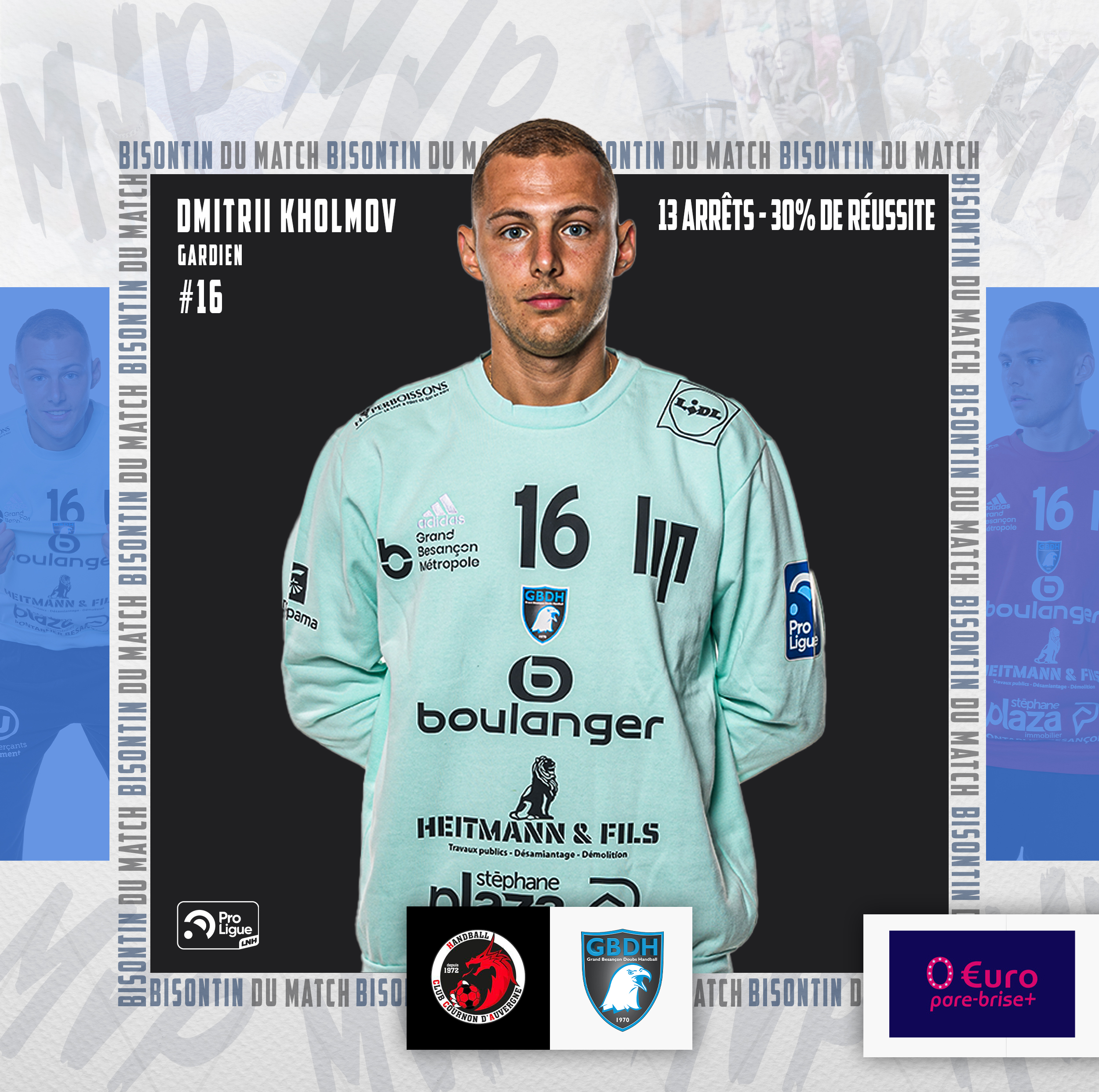 Si le GBDH n’a pas réussi à s’imposer face à Cournon, il peut tout de même compter sur un Dmitrii Kholmov en grande forme. Élu Bisontin du match Euro Pare-Brise +, le portier a brillé avec 13 arrêts et 30 % de réussite, multipliant les parades décisives pour maintenir son équipe dans la course. Malheureusement, ses efforts n’auront pas suffi à renverser la vapeur. Un match frustrant pour les Bisontins, mais une prestation à saluer pour leur gardien, véritable rempart dans un combat acharné