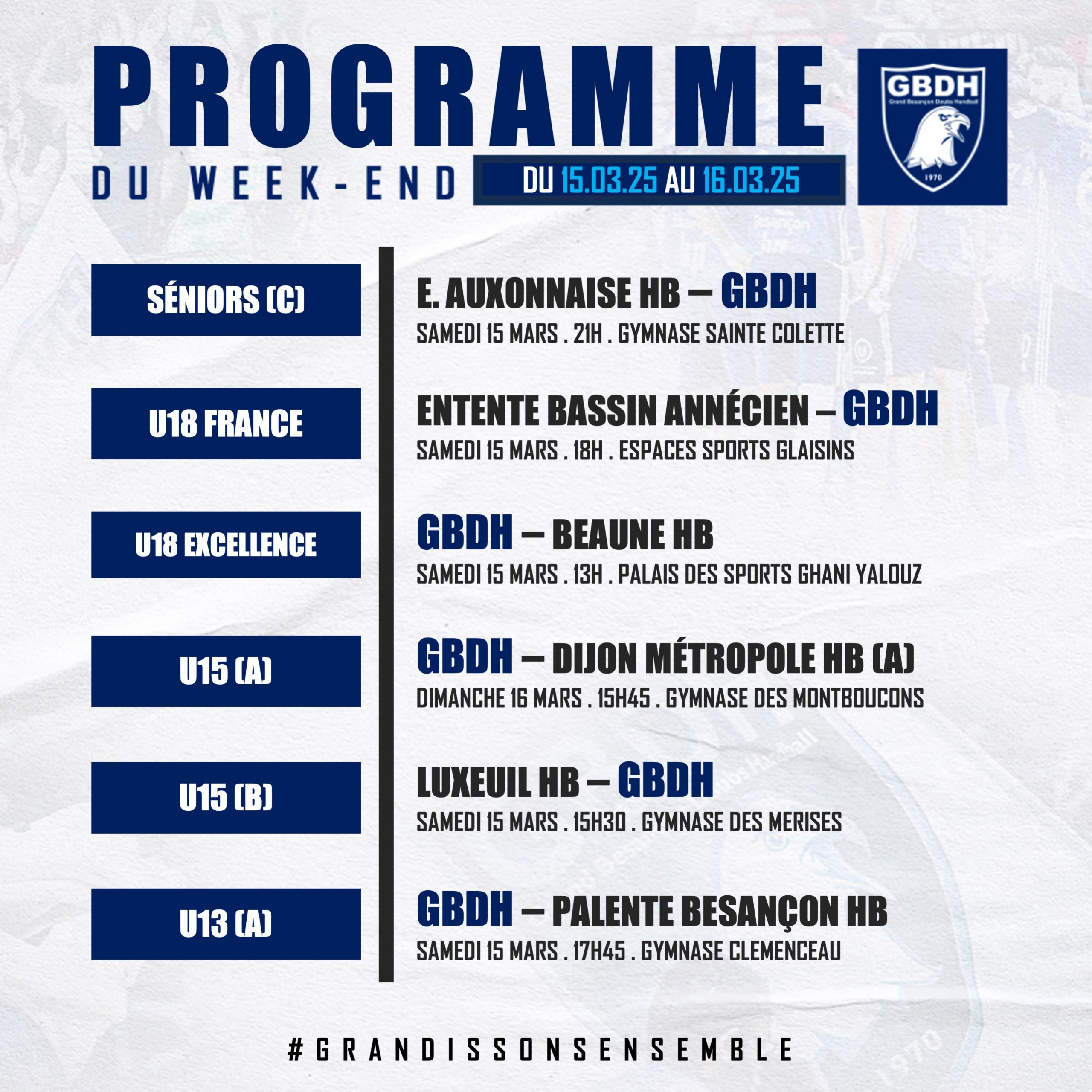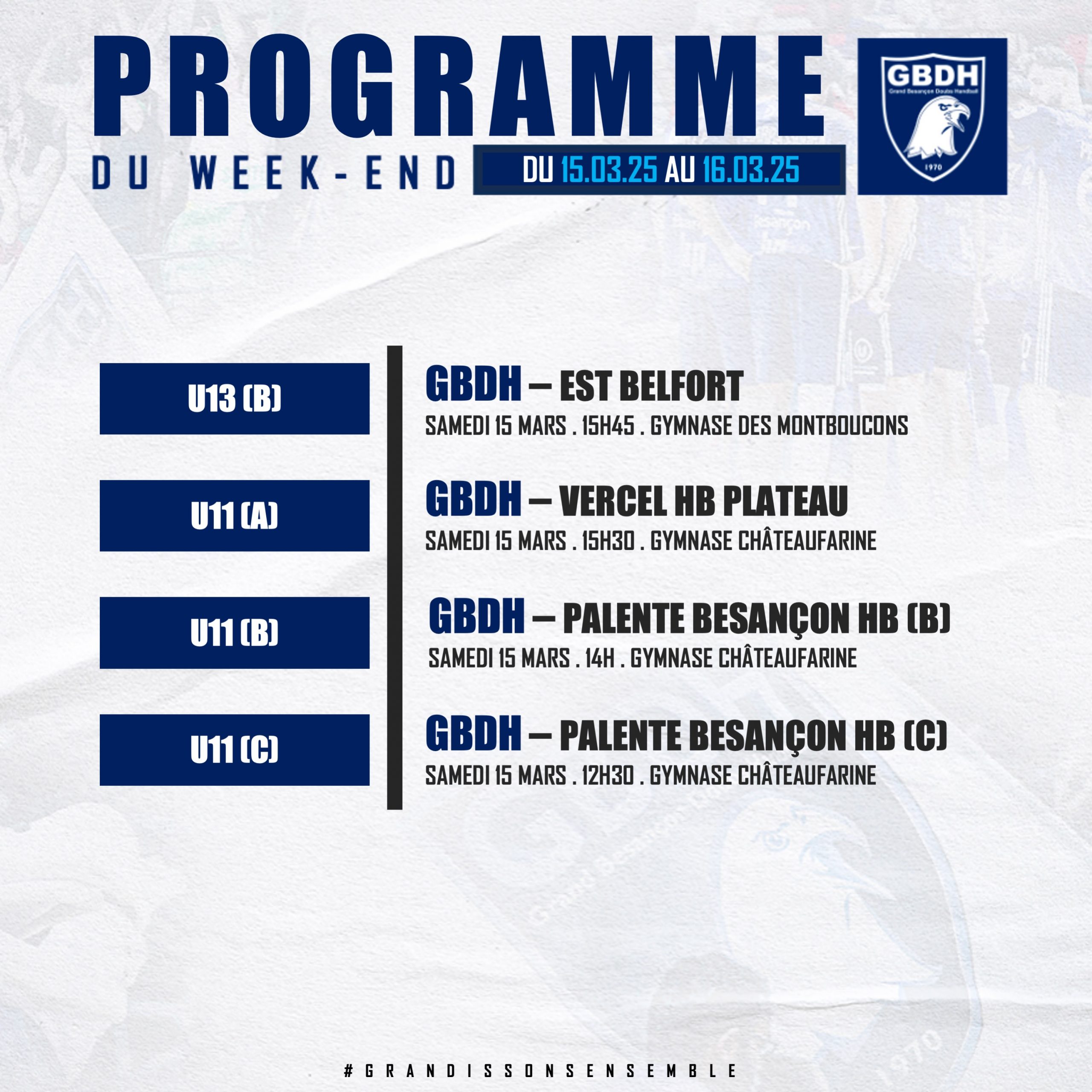 #FORMATION : LE PROGRAMME DU WEEK-END – 15/16 MARS 2025 GBDH il y a 7 mois LE PROGRAMME DU WEEK-END !Retrouvez ci-dessous les différentes rencontres de notre secteur amateur pour ce week-end ! ALLEZ LE GBDH !