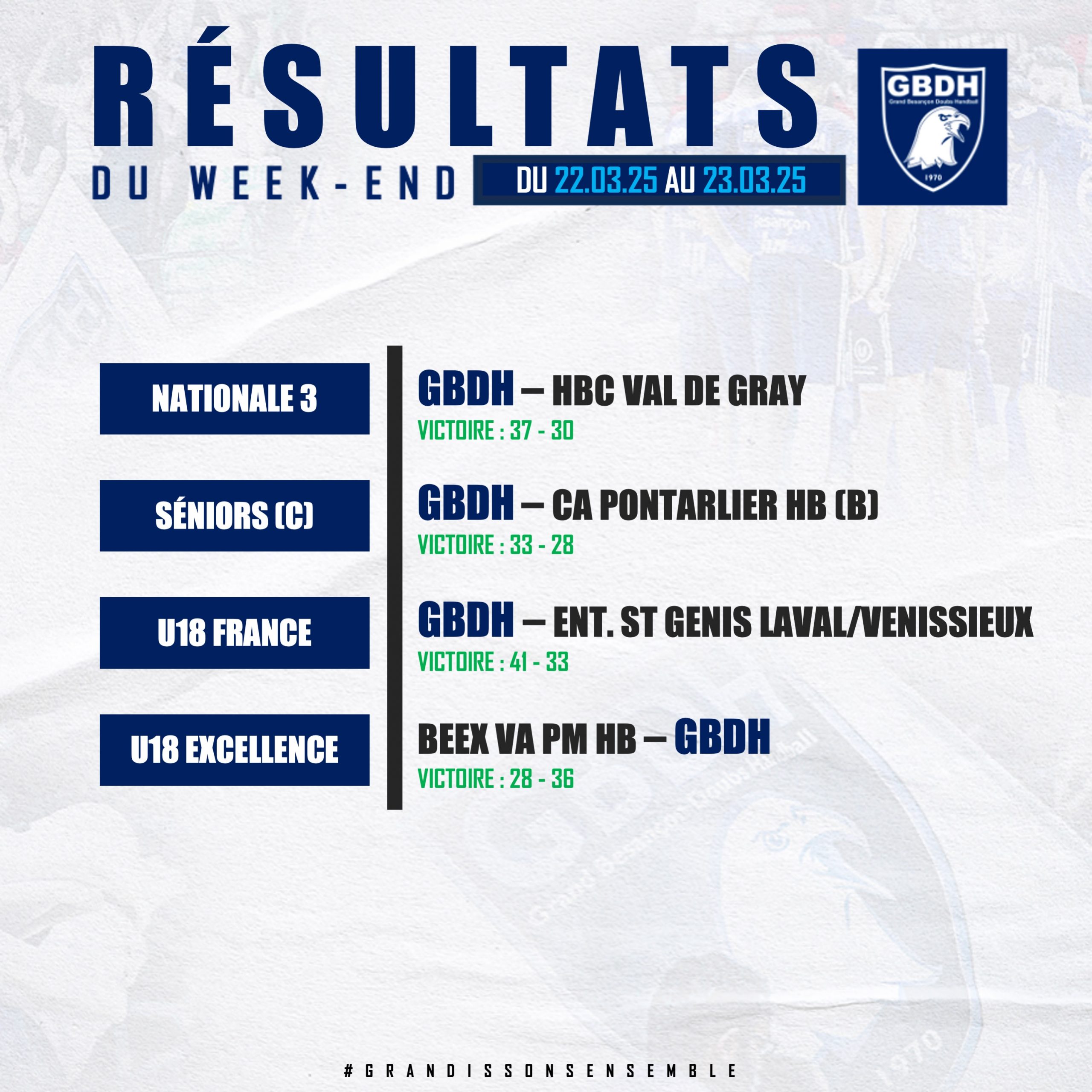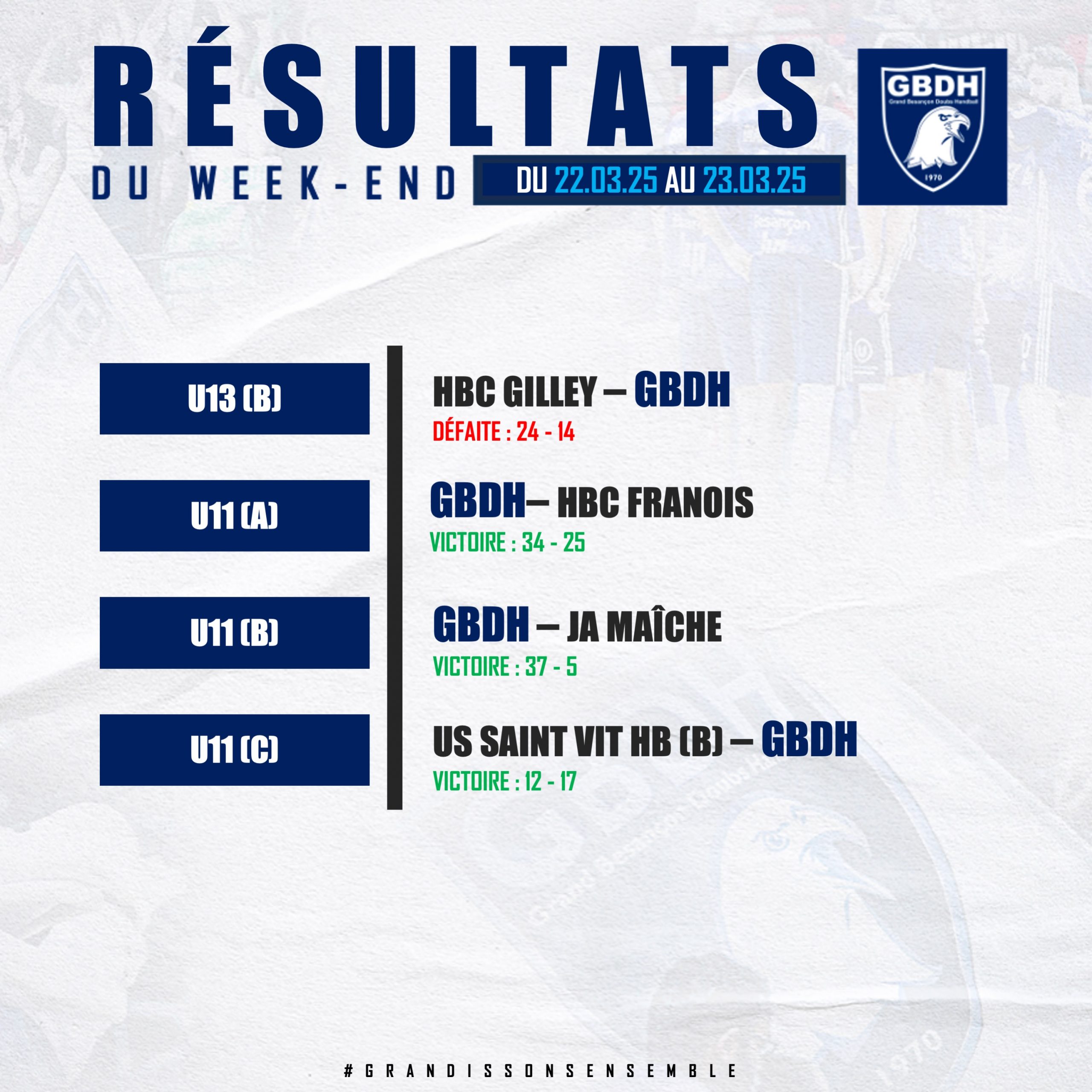 #FORMATION : LES RÉSULTATS DU WEEK-END – 22/23 MARS 2025 GBDH il y a 7 mois RÉSULTATS DU WEEK-END DES ÉQUIPES JEUNES !Les équipes jeunes du GBDH ont brillé lors du week-end des 22 et 23 mars 2025. Voici un récapitulatif des performances de chaque catégorie engagée. GRANDISSONS ENSEMBLE !