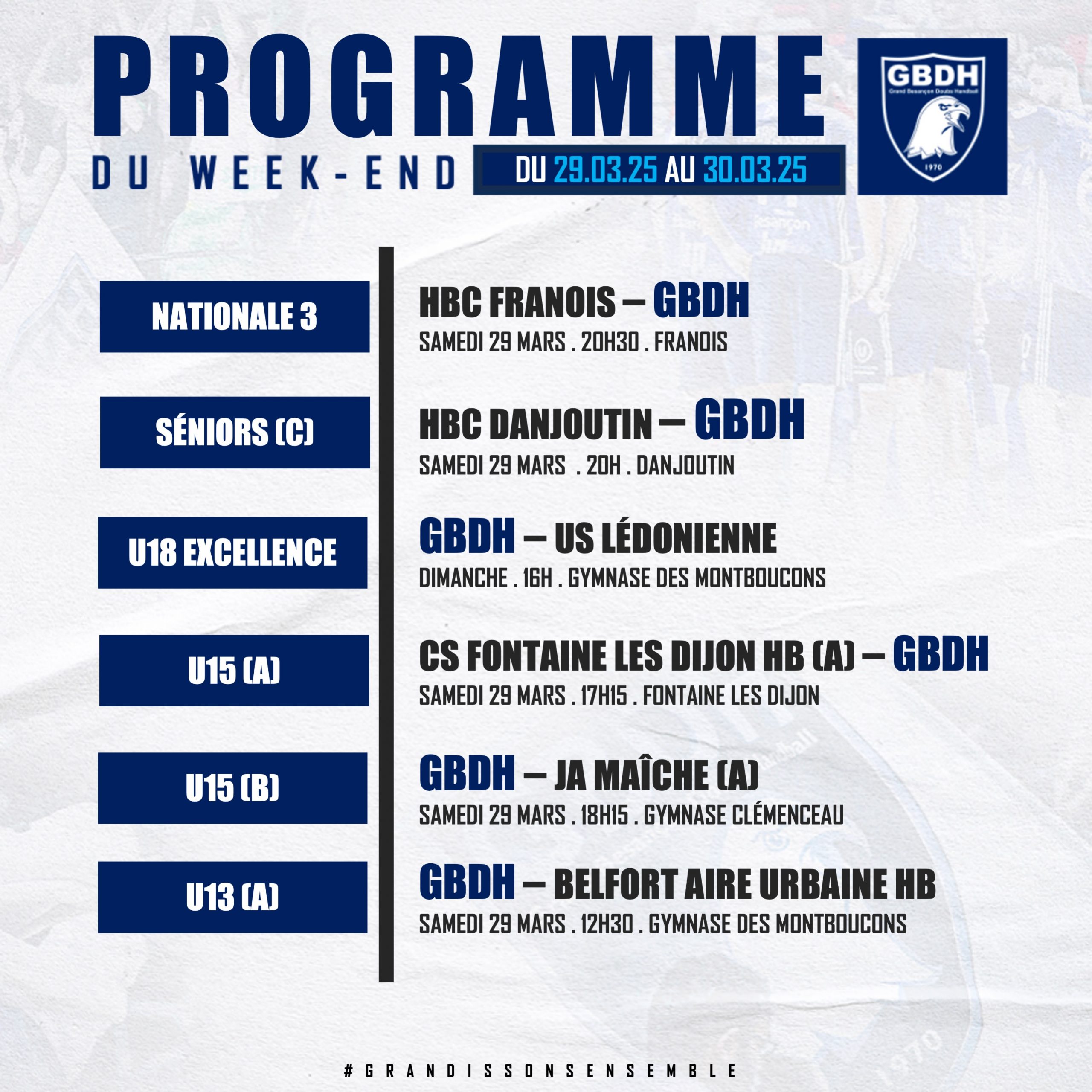 #FORMATION : LE PROGRAMME DU WEEK-END – 29/30 MARS 2025 GBDH il y a 7 mois LE PROGRAMME DU WEEK-END ! Retrouvez ci-dessous les différentes rencontres de notre secteur amateur pour ce week-end ! ALLEZ LE GBDH !