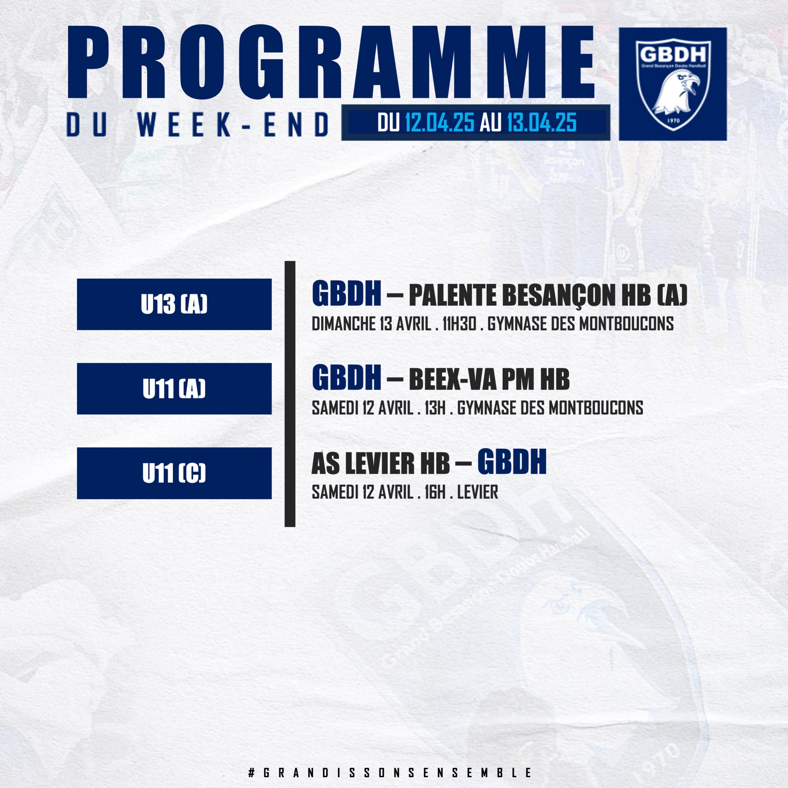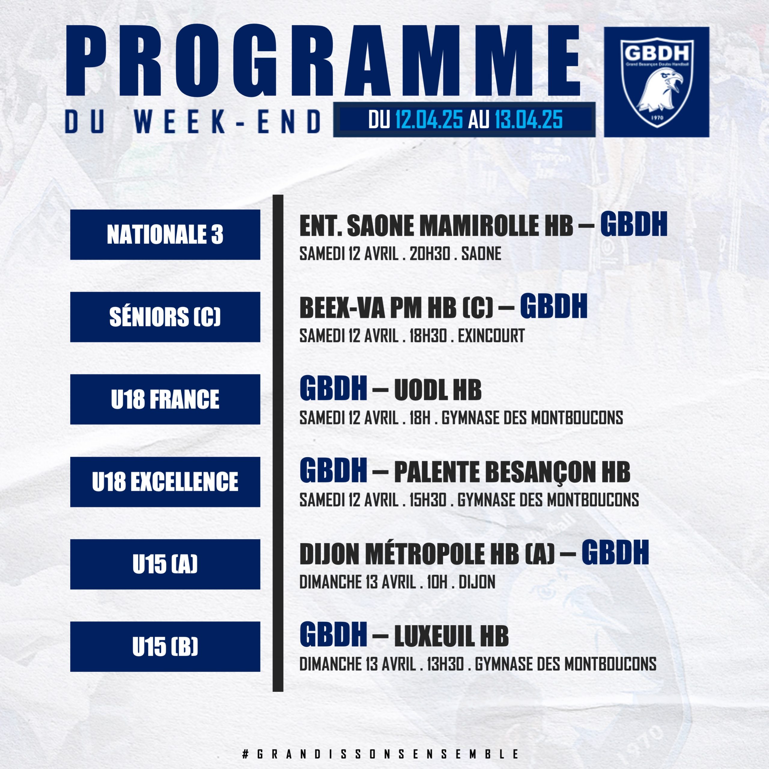 #FORMATION : LE PROGRAMME DU WEEK-END – 12/13 AVRIL 2025 GBDH il y a 6 mois LE PROGRAMME DU WEEK-END !Retrouvez ci-dessous les différentes rencontres de notre secteur amateur pour ce week-end ! ALLEZ LE GBDH !