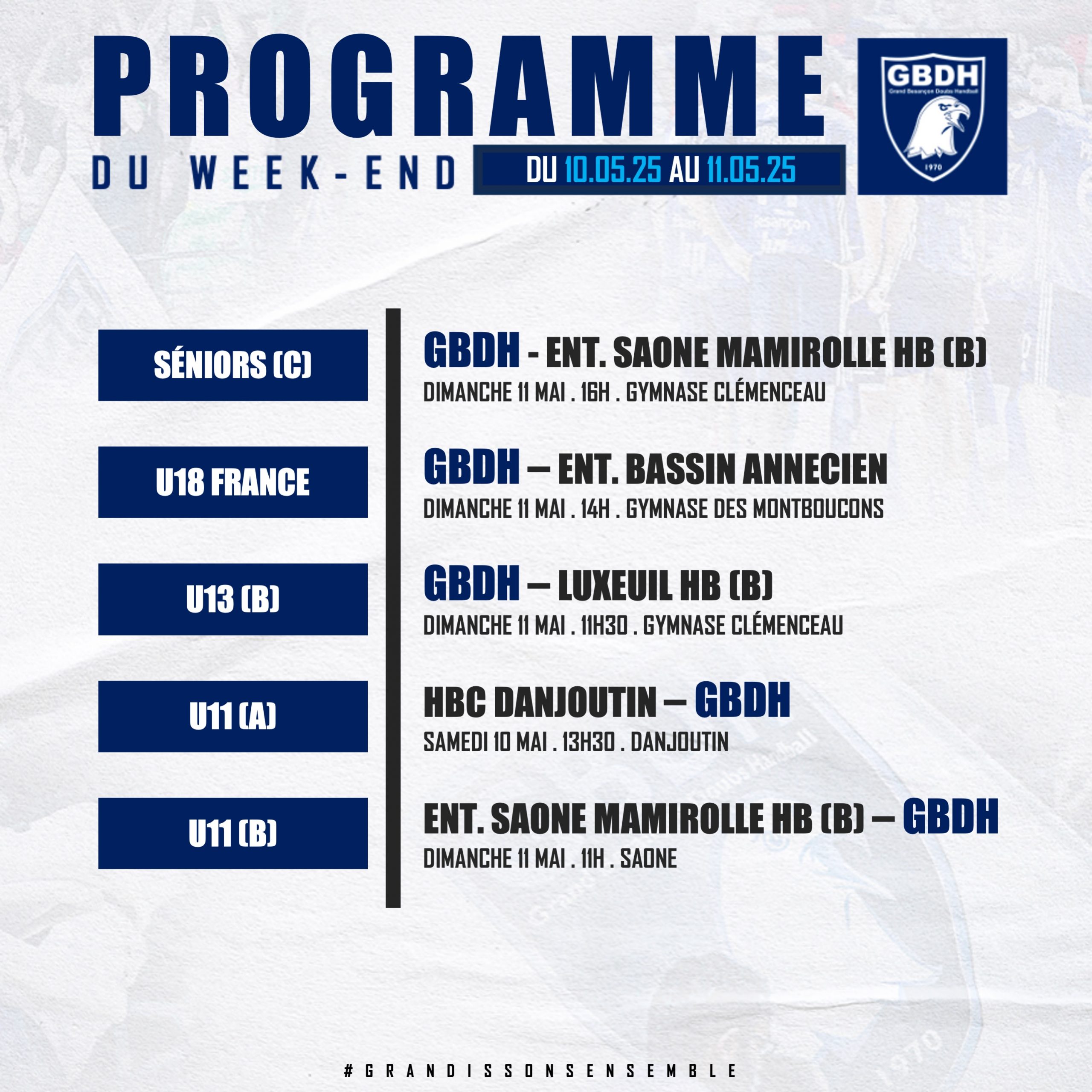 #FORMATION : LE PROGRAMME DU WEEK-END – 10/11 MAI 2025 GBDH il y a 5 mois LE PROGRAMME DU WEEK-END !Retrouvez ci-dessous les différentes rencontres de notre secteur amateur pour ce week-end ! ALLEZ LE GBDH !