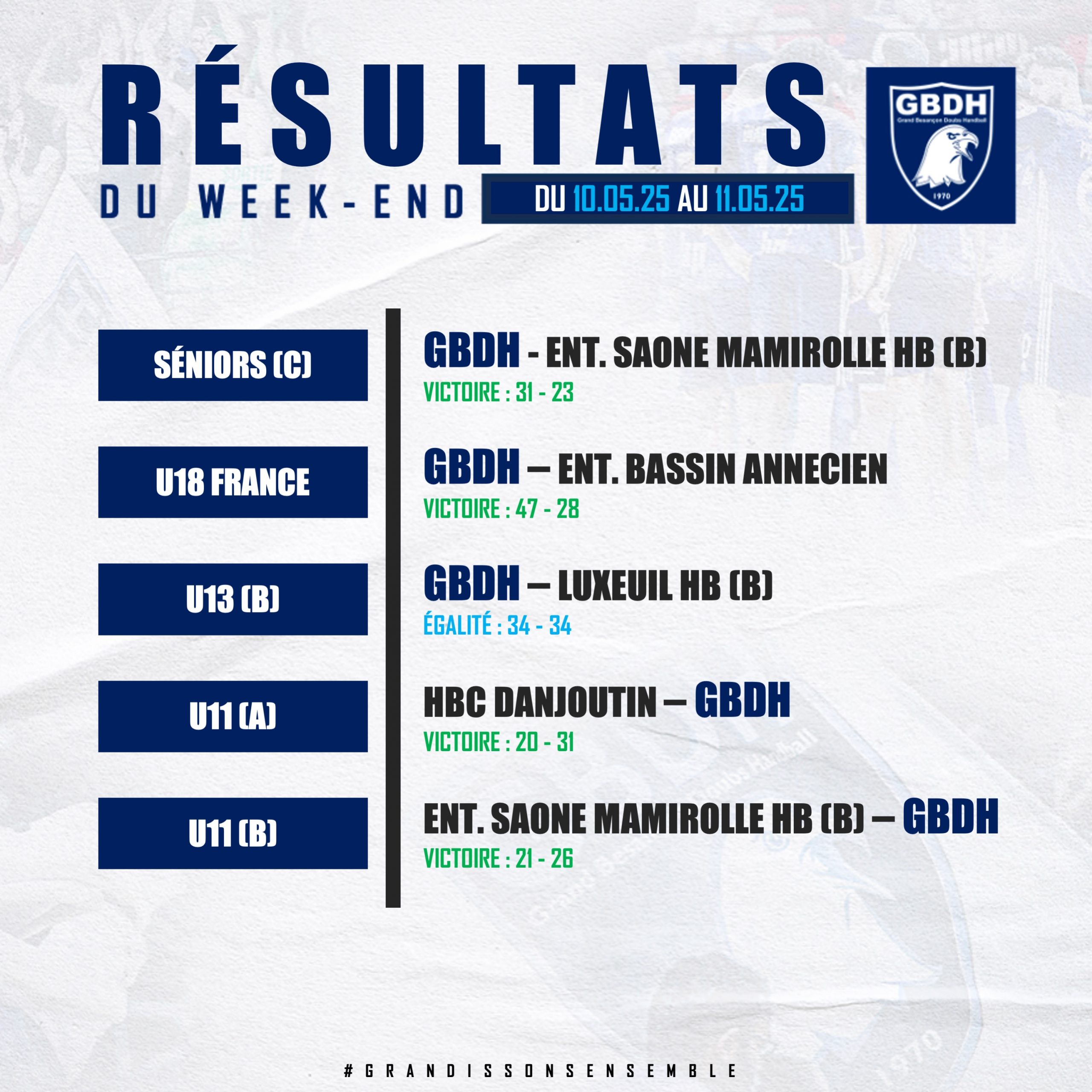 #FORMATION : LES RÉSULTATS DU WEEK-END – 10/11 MAI 2025 GBDH il y a 7 mois RÉSULTATS DU WEEK-END DES ÉQUIPES JEUNES ! GRANDISSONS ENSEMBLE !