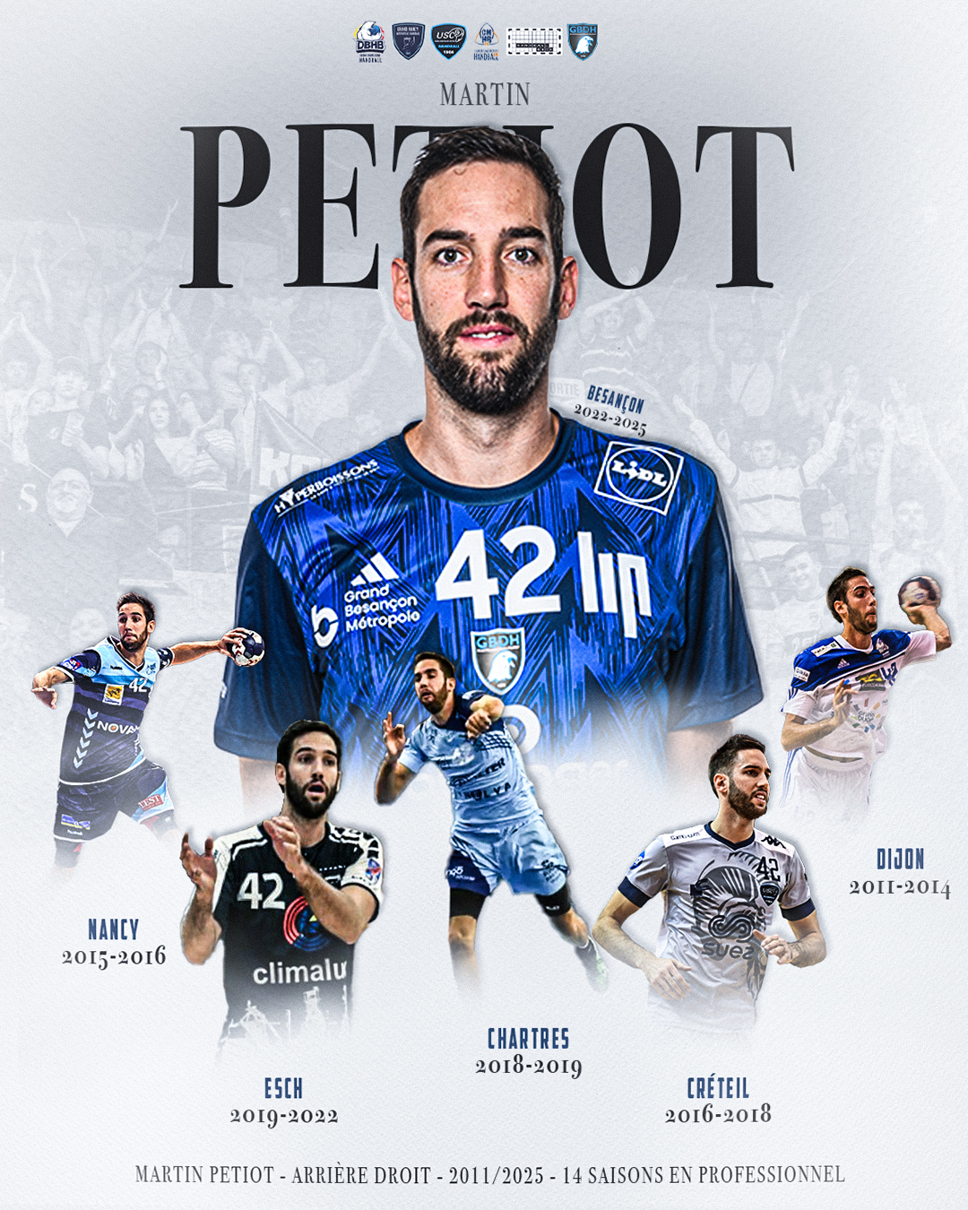 Après 14 saisons consacrées au handball de haut niveau, dont les trois dernières sous les couleurs du Grand Besançon Doubs Handball,Martin Petiot, emblématique arrière droit, a décidé de mettre un terme à sa carrière sportive professionnelle.
