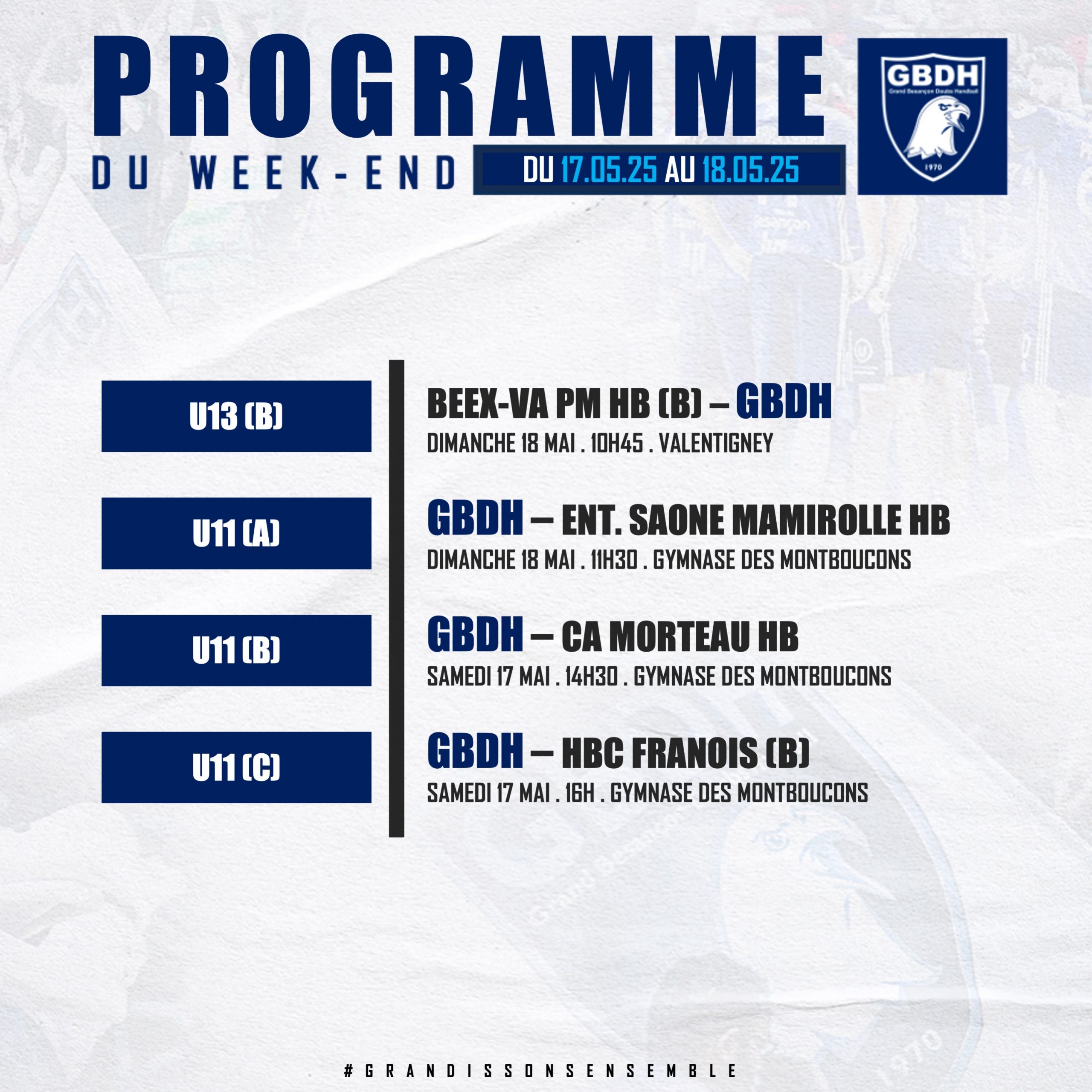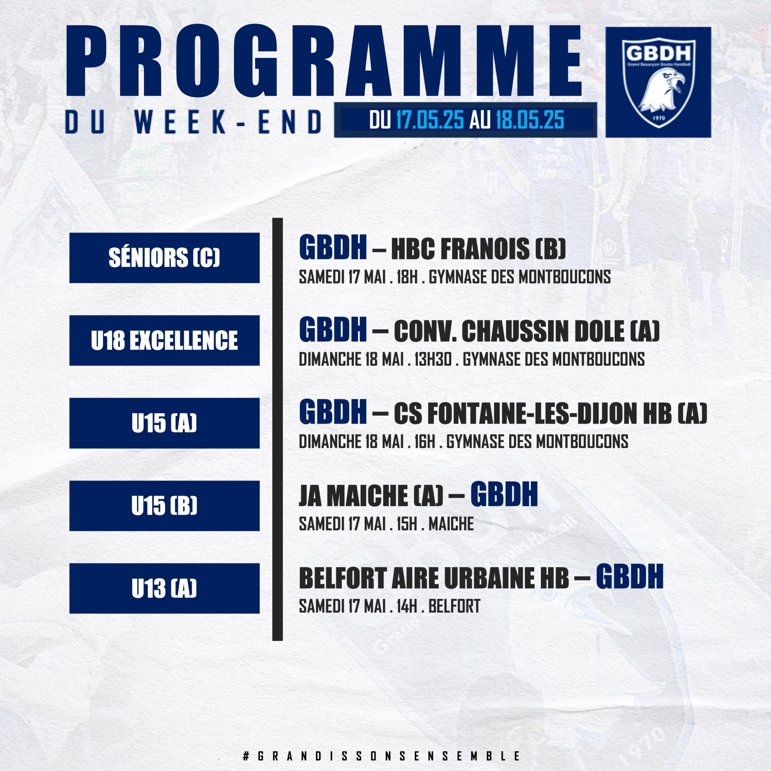 #FORMATION : LE PROGRAMME DU WEEK-END – 17/18 MAI 2025 GBDH il y a 5 mois LE PROGRAMME DU WEEK-END !Retrouvez ci-dessous les différentes rencontres de notre secteur amateur pour ce week-end ! ALLEZ LE GBDH !