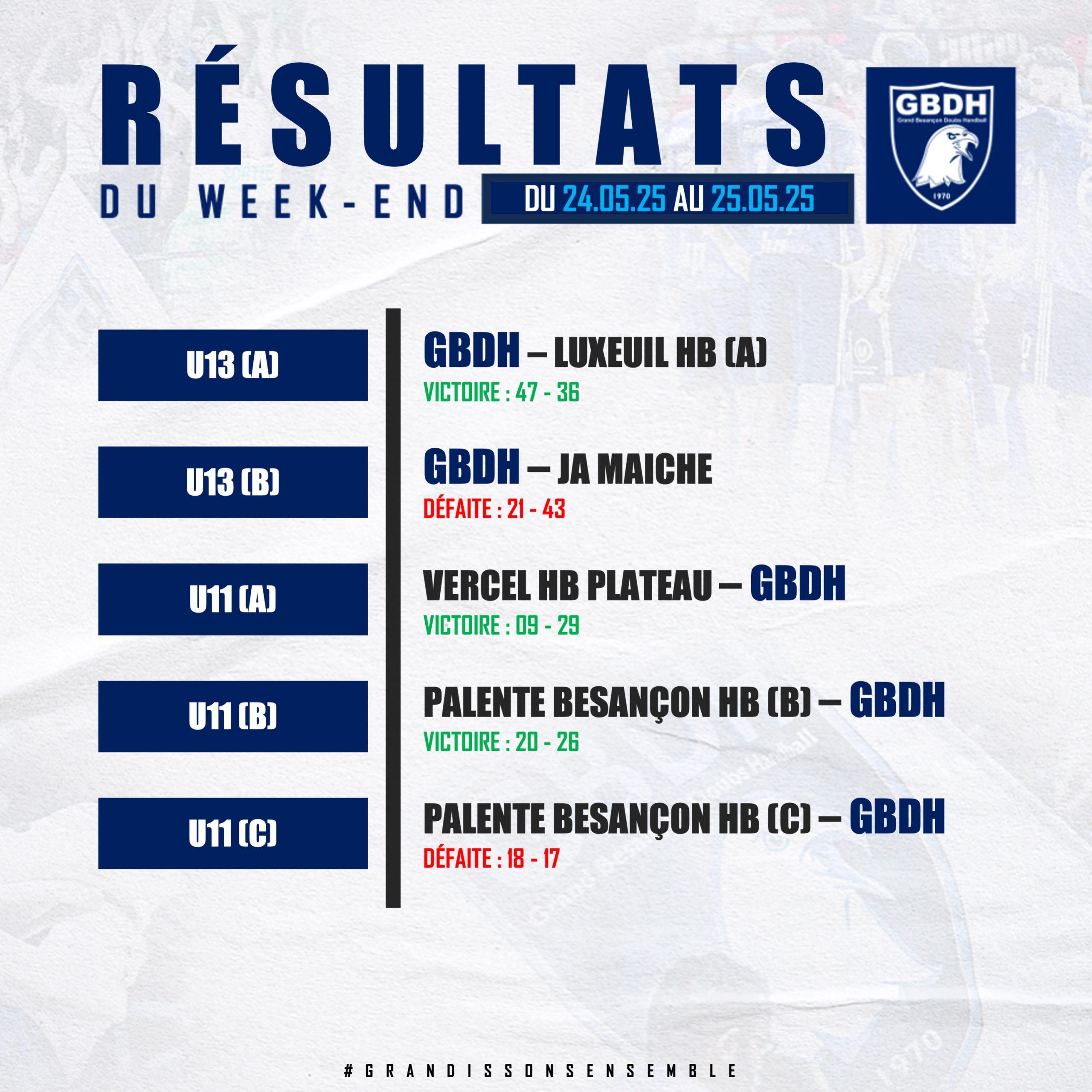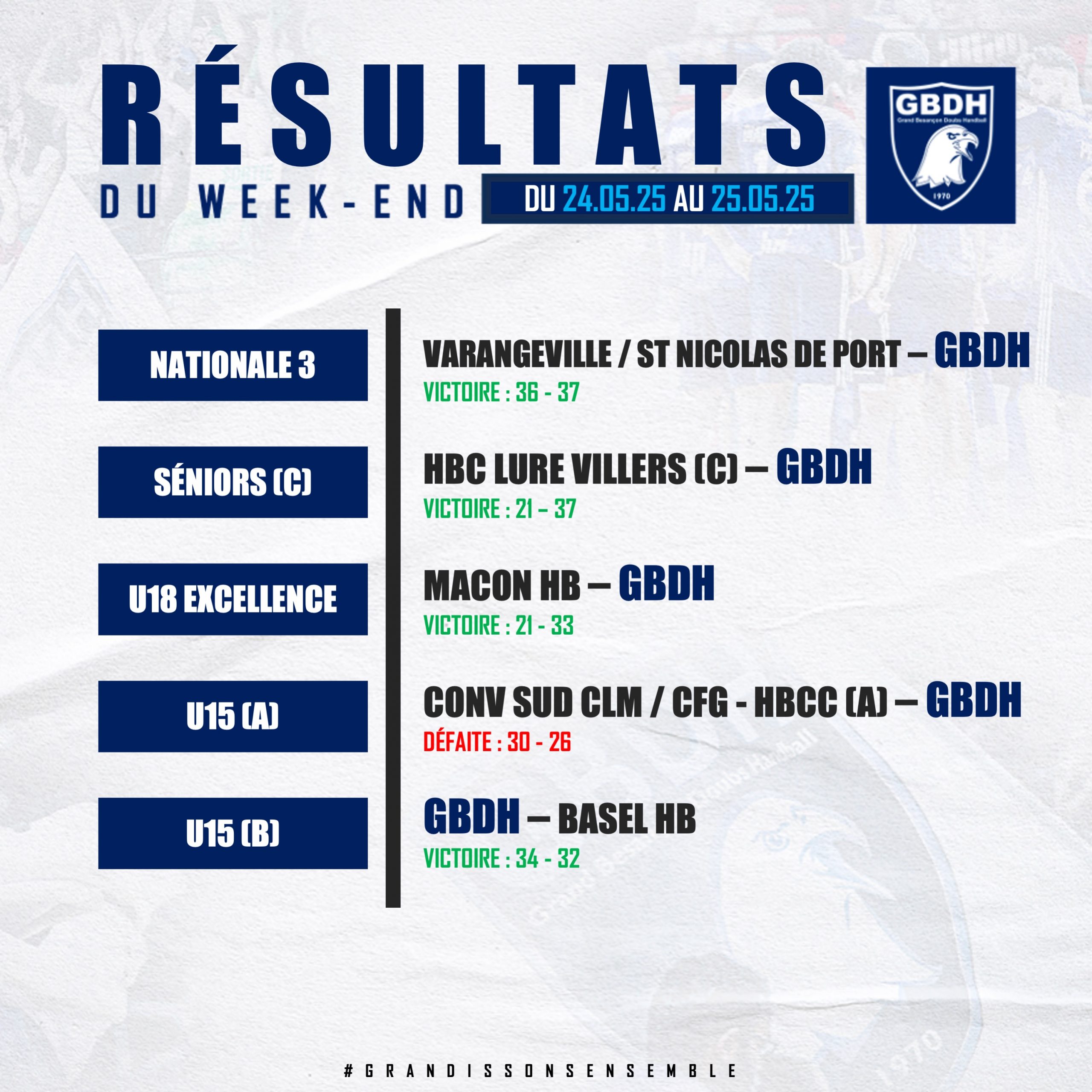 #FORMATION : LES RÉSULTATS DU WEEK-END – 24/25 MAI 2025 GBDH il y a 5 mois RÉSULTATS DU WEEK-END DES ÉQUIPES JEUNES ! GRANDISSONS ENSEMBLE !