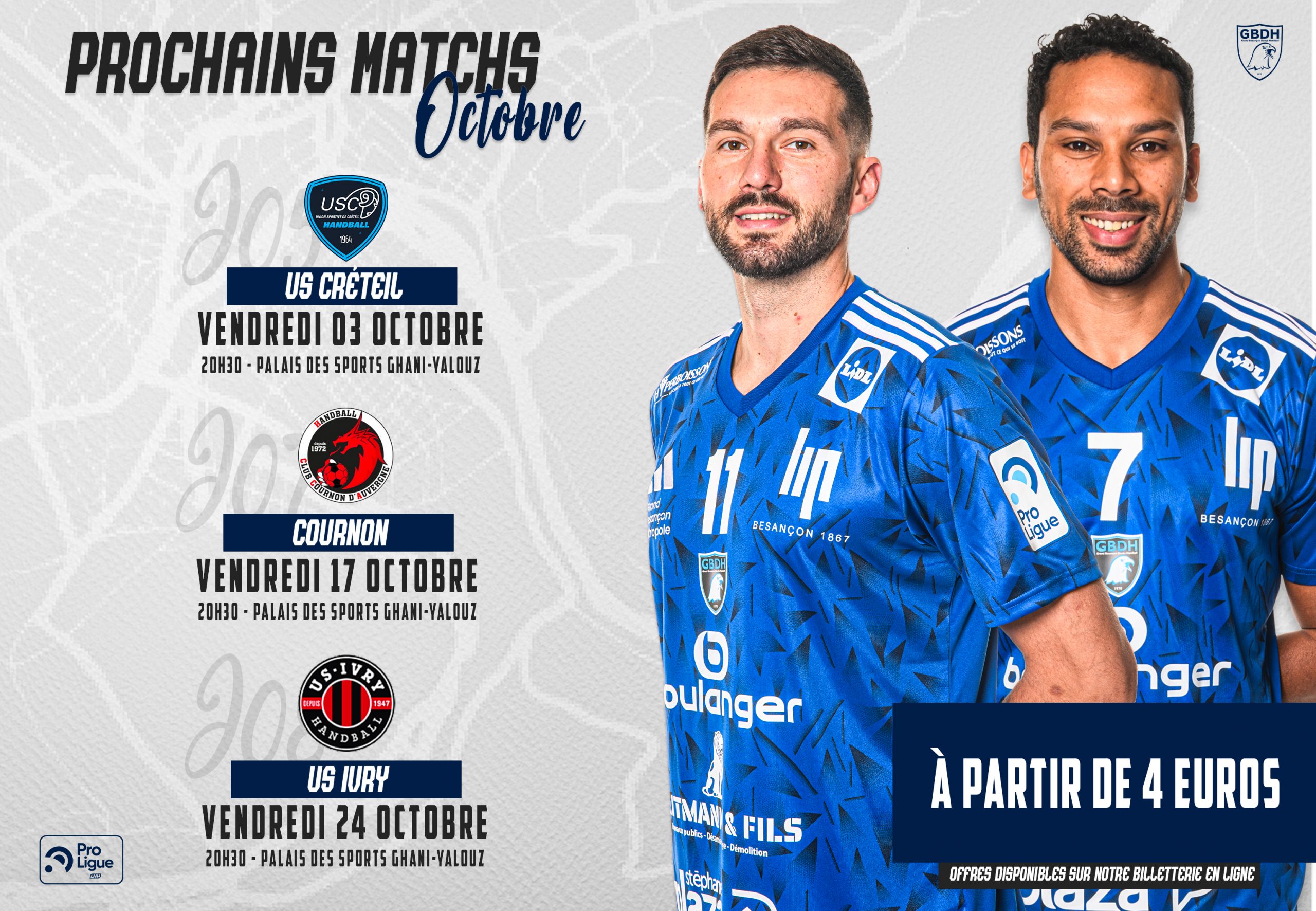 Malgré cette défaite, l’équipe montre qu’elle peut rivaliser avec les grosses formations du championnat. L’occasion de se rattraper arrive très vite pour nos Bisontins : le GBDH reçoit l’US Créteil Handball vendredi prochain au Palais des Sports, puis Cournon le vendredi 17 octobre avant de recevoir l’US Ivry Handball vendredi 24 octobre.