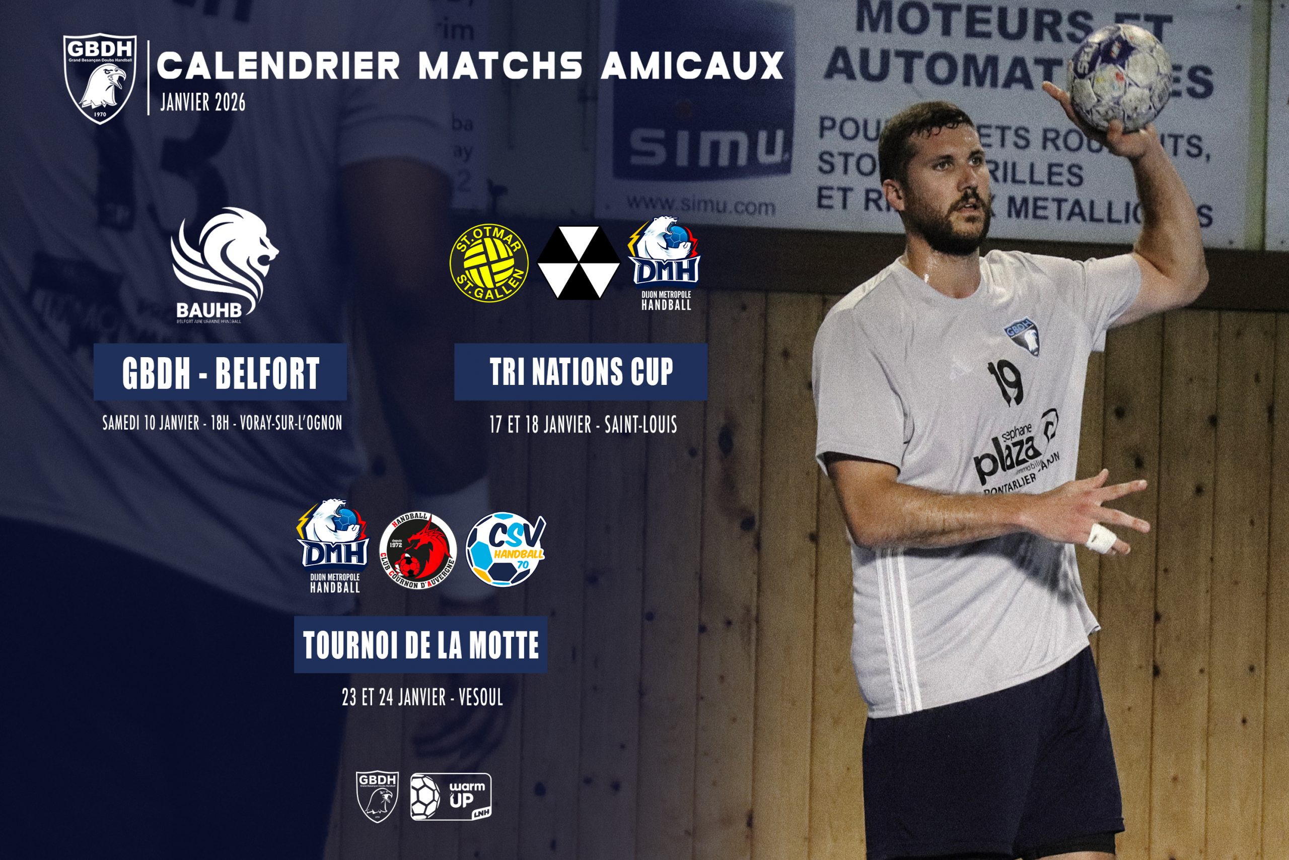 Les hommes de Christophe Viennet retrouveront ensuite Dijon le vendredi 23 janvier lors du Tournoi de la Motte à Vesoul, avant de conclure cette série de matchs amicaux le samedi 24 janvier face à Vesoul (N1 Fédérale), toujours dans le cadre du Tournoi de la Motte.