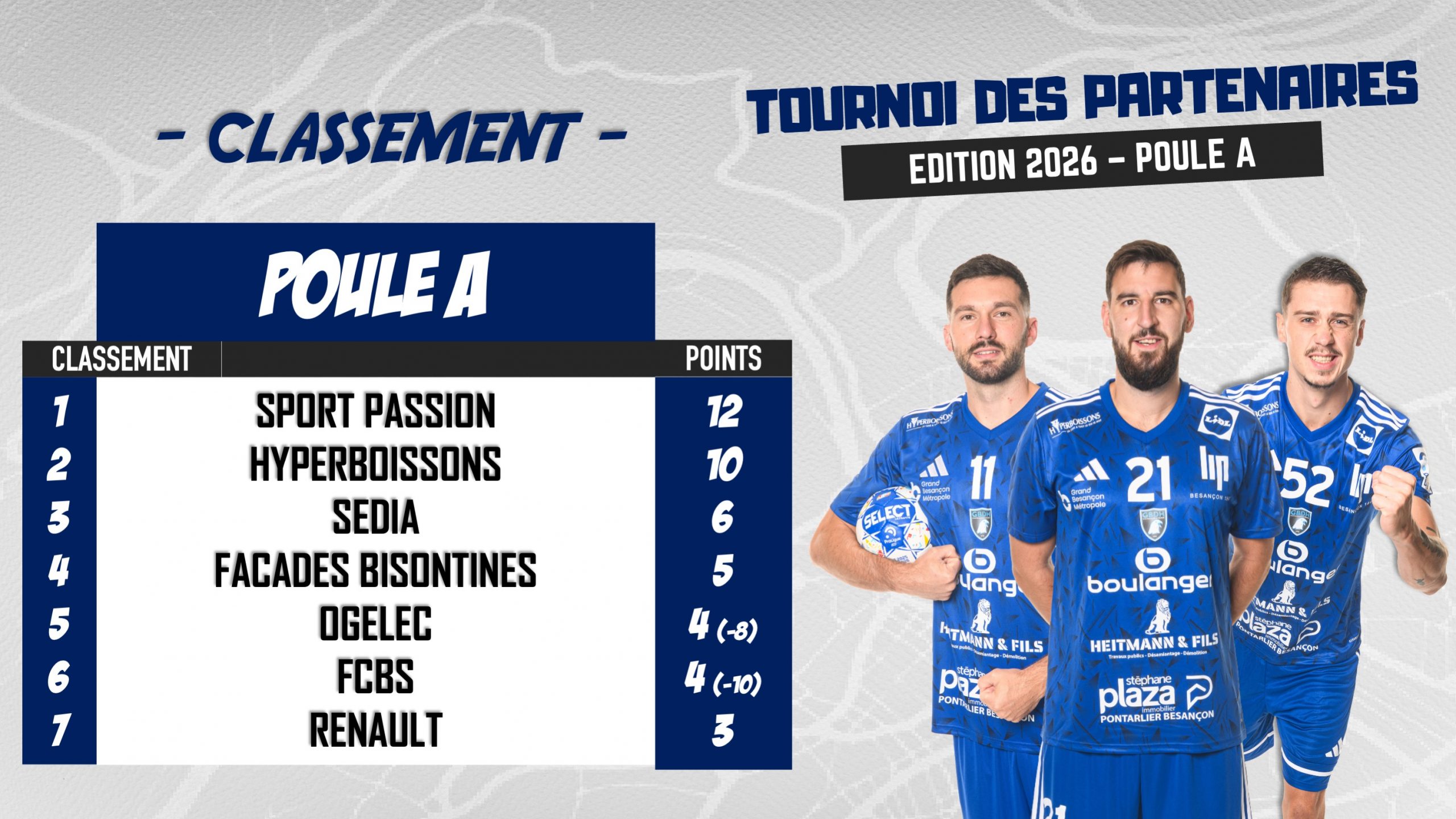 Hier soir s’est tenue la première poule de qualification pour l’édition 2026. Découvrez ci-dessous le classement final ainsi que les photos des sept équipes partenaires